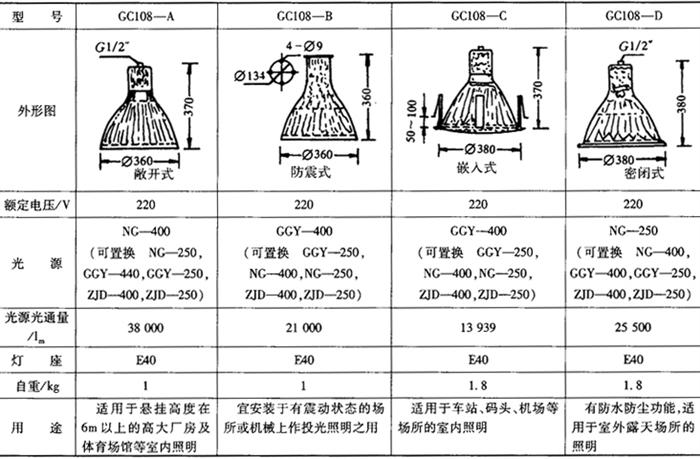表9-63 GC108型板块面照明灯