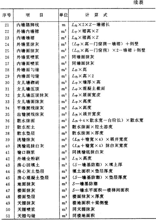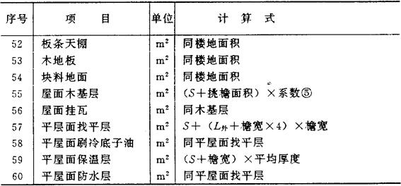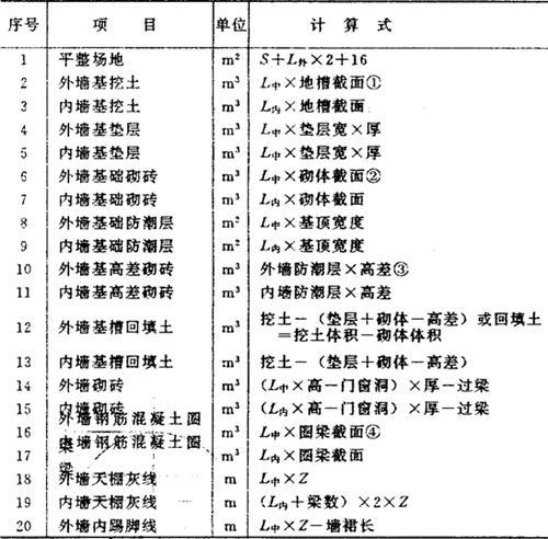 释义 | 工程量计算统筹式 工程量计算统筹式中: S-底层建筑面积; L中-外墙中心线; L内-内墙净长线; L外-外墙外边线; Z-层数。 表2-40 工程量计算统筹式表 注:①挖地槽截面=(b+KH)×H 式中 b-槽宽;H-槽深;K-放坡系数。 ②砖墙体截面=墙厚×高 ③高差切体(砖)计算式: V=(H+0.36-h)B×L 式中 H-基础埋置深度; h-基础高度; B-墙厚; L-墙长; ④圈梁截面一般民用建筑圈梁高为12、18、24厘米。 ⑤屋面坡度系数,见本章屋面工程屋面坡度系数表。 图2-56 |