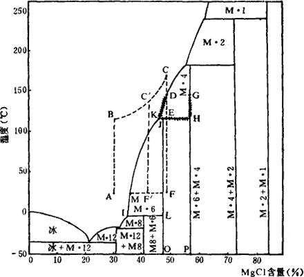 释义 | 工艺原理 生产氯化镁的原料一般用制溴后的废液(用浓厚卤提溴后的母液)。其密度为1.3g/cm3(33~34°Bé),化学组成见表6-5-1。由表可见,制溴废液中MgCl2的浓度已相当高,只需蒸发部分水分和分离掉杂质盐类,就可制得产品。因原料液中杂质盐很少,基本可以看成是MgCl2-H2O体系,生产工艺原理可用MgCl2-H2O体的相图进行分析,见图6-5-1。 表6-5-1 制溴废液组成 图6-5-1 氯化镁生产工艺原理分析图 M·l2-MgCl2·12H2O M·8--MgCl2·8H2O M·6-MgCI2·6H2O M·4-MgCl2·4H2O M·2-MgCl2·2H2O M·1-MgCl2·H2O 图6-5-1中的A点为原料液的组成点(约含MgCl2,30%,25℃),因高浓度MgCl2溶液的饱和蒸汽压很低,在常温下自然蒸发速度很慢,生产上多采用高温沸腾蒸发。控制终止沸点在163~180℃时,冷却后得到含MgCl245~50%的产品。在MgCl2-H2O体系的相图上,其具体过程是:体系点A→B点是卤水的升温过程,到B点卤水开始沸腾并蒸发水分。随着浓度的提高卤水的沸点也不断升高,体系点由B点沿BC曲线向C点移动,到达C点时(沸点约为170℃),停止蒸发,并将清液进行冷却。当温度降到D点(约为152℃左右)时,开始有MgCl2·4H2O结晶析出。继续冷却降温,体系点沿DE线向E点移动,此时液相点沿DK线向K点移动,固相点沿GH线向H点移动,在此过程中只有MgCl2·4H2O析出。当体系点到达E点时(液相点为K点,固相点为H点),MgCl2·6H2O饱和。继续冷却,体系点E和液相点K不动,固相点沿HE线向E点运动,此时原析出的部分MgCl2·4H2O转溶成MgCl2·6H2O晶体析出。当固相点到达E点时,液相消失,MgCl2·4H2O未转溶完就全部凝固,此时固相为MgCl2·4H2O和MgCl2·6H2O的混合晶体。继续冷却,固相组成不变,只是温度不断降低,直至冷却到常温。体系点由E点降到F点,全部过程结束。 |