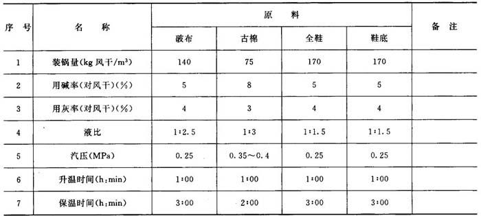 破布、全鞋、鞋底的蒸煮采用烧碱石灰法、烧碱去油污,石灰脱色,由于布类原料在蒸煮中不能分丝,只能采取汽倒料的工艺方法。