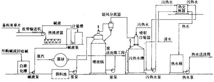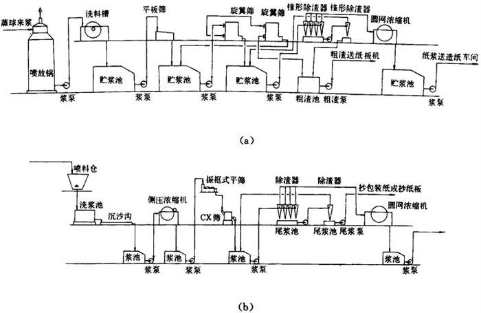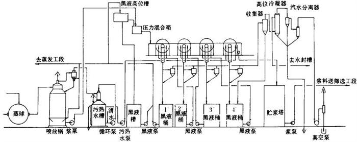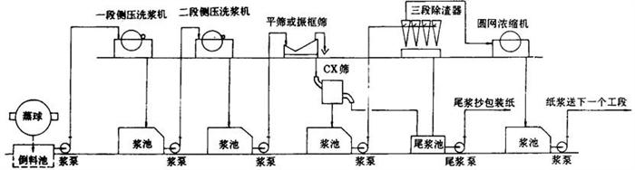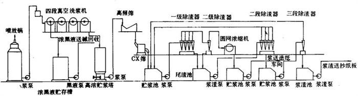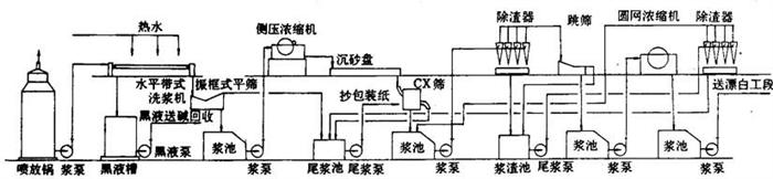 释义 | 工艺方法技术条件与操作要点 1.切料工序工艺流程、技术条件与操作要点 (1)切料工序工艺流程 图5-3-5 切料工序工艺流程 (2)切料的质量要求 ①切草长度(mm):25±5; 有预浸渍装料的切草长度(mm):30~50。 ②合格率(%):大于85。 ③草料水分(%):10~30。 ④草料外观呈黄色,不霉烂变质,不带其他杂质。 (3)切料操作要点 ①切料前检查原料有否合格证,并检查实样。 ②切料时捆草用的野藤条,麻绳、铁丝等必须在装到运输带上后马上割断并抽出,不得混入草料中。 ③开切料机前,必须得到蒸煮间的联系信号。 ④喂料必须均匀,不得太厚,防止堵料,草料厚度200~300mm。 ⑤注意安全操作规程,严禁在运转时上皮带。切料前检查各部螺丝、机件是否完好,若换过刀,必须由班长复查,才可开车。 ⑥切料完毕将地面清扫干净。 ⑦飞刀每班换1次,底刀每周换2~3次。 ⑧切料损失5%左右。 2.蒸煮工艺方法技术条件与操作要点 (1)蒸煮工序工艺流程 图5-3-6 蒸煮工序工艺流程 (2)稻草蒸煮工艺方法、技术条件(表5-3-1)。 表5-3-1 稻草蒸煮工艺方法与技术条件 (3)麦草蒸煮工艺方法、技术条件(表5-3-2) 表5-3-2 麦草蒸煮工艺方法技术条件 漂白麦草浆,用碱量受麦草质量的影响,新麦草比陈麦草增加1%的用碱量(NaOH)。 由于漂白麦草浆生产的纸张品种不同生产中普遍采用球外预浸渍及快速蒸煮法,即延长升温时间,缩短保温时间,有些厂取消保温时间。 常用的几种蒸煮曲线: ①延长升温,不保温; ②缓升温,短保温; ③短升温,长保温。 注:③曲线用于生产硬度低易漂白的稻麦草浆,生产比较高档次的薄页纸用。 (4)操作要点 ①蒸煮用的各类化学品,必须专人负责,并且做好收入支付记录,交接班时要验收核实。 ②化学品按工艺条件放入到白液桶溶解或稀释后,方可进行加温,温度必须控制在90℃以上。 ③装料时若无预浸设备,开始装料后约10min徐徐将化学品加入到球内,同时缓缓进汽。若有预浸渍设备,切料后草料由运输带送入螺旋预浸设备时,同时开始徐徐加入化好的蒸煮白液,两者操作时必须保证草料与白液同时装完。 ④装料完毕后必须清扫地面上的散草片,同时装到球内,防止落到楼下。 ⑤球盖螺栓必需对面二边换次旋紧,防止单面松紧。 ⑥进汽前与动力锅炉车间联系,得到同意后,徐徐进汽。按工艺技术条件控制。 ⑦蒸煮完毕,停下蒸球,若是倒料,卸盖向下,先进行放汽到压力为零。然后蒸球的铆盖向上,准备开铆盖,开后倒料。若是喷料,锅口部向上,接好喷料管,全压喷料,若为轴头喷料,打开喷料阀门由小徐徐开大。 ⑧倒料或喷料后,倘未接着装料,球口必须向下,待下次装料时转正球口。 ⑨蒸球中心轴有蒸汽强化管时,每次喷料或倒料后,稍开蒸汽,清除强化管的缝隙阻止堵塞,每隔3月检查1次,用锯条清理缝隙。强化器管上缝隙必须保持畅通,以免影响蒸煮后草浆料质量。 3.洗涤筛选工艺流程技术条件与操作要点 (1)洗涤筛选工序工艺流程 ①草浆最简单的洗涤筛选工艺流程(图5-3-7a和b)。 图5-3-7 草浆最简单洗涤筛选工艺流程 ②真空洗浆机提取麦草浆黑液与洗涤筛选工艺流程(图5-3-8)。 图5-3-8 真空洗浆机提取麦草浆黑液与筛选洗涤工艺流程 ③麦草浆用水平带式过滤机提取黑液与洗涤工艺流程(图5-3-9)。 图5-3-9 麦草浆用水平带式过滤机提取黑液与洗涤工艺流程 ④稻草浆洗涤工艺流程(图5-3-10)。 图5-3-10 稻草浆洗涤工艺流程 ⑤真空洗涤浆机提取黑液工艺流程(图5-3-11)。 图5-3-11 真空洗浆机提取麦草浆黑液工艺流程 (2)洗涤筛选工艺技术条件 ①球下池假底洗涤浆料 梅花眼孔径:3~10mm; 滤网网目:40目(聚酯网或尼龙网); 假底坡度:3~5%; 假底距真底高度:0.5m左右。 ②平板振框筛 进口浓度(%):0.7~1.0; ③侧压式浓缩机 网目:40~50目(聚酯网或尼龙网); 生产能力:1.5~2.5t/d·m2; 进浆浓度:2~4%; 出浆浓度:7~12%; 白水浓度:0.025~0.04%。 ④真空洗浆机四段逆流洗涤筛选技术条件(表5-3-3)。 表5-3-3 真空洗浆机洗涤工艺条件 ⑤浆料筛选和精选工艺条件(表5-3-4)。 表5-3-4 浆料筛选和精选工艺条件 ⑥水平带式洗浆机洗涤、筛选工艺技术条件 进浆浓度(%):2~3.5; 出浆浓度(%):10~13; 总表真空度(MPa):0.04; 各段分表真空度(MPa):0.02~0.03; 浆层厚度(mm):3~5; 车速(m/min):20~25; 逆流洗涤:4~6段; 洗涤水温度(℃):70~80; 低压冲水管水压(MPa):0.2~0.3; 高压冲水管水压(MPa):1.2~1.8; 喷水量(L/s):1.2~1.4; 稀释因子:1~3t水/t浆。 (3)操作要点 ①蒸煮放料操作要点 a.用假底球下池初步洗涤时,每次放料前,先检查滤网是否破损,对于破损及结垢影响滤水的滤网应及时更换。 b.用喷放放料时,喷放锅空锅不能喷放,空锅喷放前应向喷放锅内加点黑液,并经过搅拌后,才能喷放。 c.喷放锅底部浆浓必须控制在2.0~2.5%时,才能送料。 d.推进器不运转时,不许喷放,也不准送浆。 e.黑液桶内必须有一定黑液的贮存量,以保证开车时真空系统运转正常。 f.黑液送碱回收,每次供应时必须取样测定浓度与温度,并计量,黑液的质量应符合工艺规定的质量指标。 g.喷放锅中贮存的浆料不宜过多,时间不宜过长,否则会给送浆带来一定的困难,使送浆浓度不易掌握。 ②真空洗浆机操作要点 a.多台真空洗浆机串联使用中,常装有旁通管,当其中一台发生故障时,浆料可由进浆槽或稀释槽操作侧的旁通管绕过,进入另一台洗浆机的稀释搅拌槽,并在停用鼓槽的进浆侧用木板拦截浆流,以提高浆位,继续生产。 b.掌