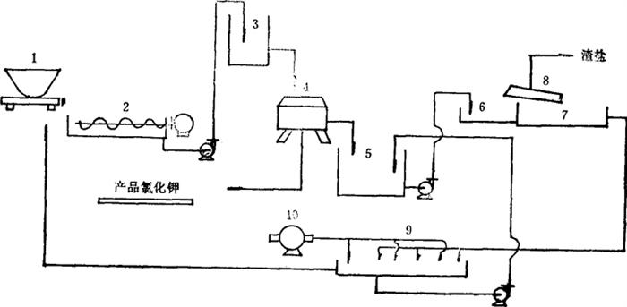 释义 | 工艺流程及主要设备 某制盐化工厂采用图6-7-3所示的工艺流程洗涤钾石盐生产氯化钾。 图6-7-3 洗涤钾石盐生产氯化钾工艺流程图 1-钾石盐原料斗车 2-洗涤机 3-高位槽 4-离心机 5-洗钾水池 6-预热锅 7-浓缩锅 8-盐棚 9-冷却结晶池 10-鼓风机 由车间运来的原料钾石盐,倒入洗涤机(2),同时加适量水洗涤;洗涤机中的螺旋搅拌器应连续搅动,使氯化钠能迅速、充分溶解。产品氧化钾能达到一级标准。根据表6-2-21溶解度数据和实践经验,对于含氯化钾为50~55%的钾石盐原料,每800kg加入水0·8~0·9m3进行洗涤是合适的。在洗涤机里搅拌洗涤15min以上,然后泵至高位槽(3),以便流入离心机(4)脱水。氯化钾在离心机中与母液分离后,用少量水洗涤,再将水充分分离。从离心机里卸下的氯化钾产品即可直接进仓和包装,不需另外进行干燥。 从离心机中分离出来的洗钾水流入洗钾水池(5),洗钾水的浓度一般是24°Bé左右但在实际操作中,从洗涤机(2)里取出的少量悬浊液,因含有大量悬浮物,浓度往往高于24°Bé。所以,实际生产中常以27°Bé为控制指标。 当钾石盐中的含硼量(以总硼酸计算)少于2%时,洗水可溶解其中大部分的硼酸或硼化合物随水带走。但当钾石盐中的含硼量超过2%时,由于硼化合物在冷水中的溶解度小,大量硼化合物将残留在产品氯化钾中,影响其质量。这就需要漂硼:先在料液里加少量盐酸,使所有的硼化合物都转变为硼酸;用泵将料液从洗涤机(2)泵入高位桶(3),用强力的搅拌器将氯化钾晶体和硼酸晶体搅动浮起;由于两者下沉速度不同,当氯化钾晶粒迅速下沉到高位桶底部,而大部分硼酸晶粒还没有下沉时,迅速将高位桶的支管阀门打开,使大量尚未下沉的硼酸晶粒随洗钾水从支管流出,沉积在洗钾水池(5)底部,待积累到一定程度以后,再取出提制硼酸。当钾石盐中含硫酸钙较多时,同样要用这种办法将它漂离。 流入池中的洗钾水含氯化钾130~150g/L,需尽量收回,其操作过程是:1.将洗钾水泵入预热锅(6)预热,再转入浓缩锅(7)进行蒸发浓缩,当料液浓度提高到27~28°Bé后,氯化钠大量析出,随即捞出置盐硼(8)上。2.当料液浓度达到30~31°Bé时,尽量分离其中的氯化钠,然后将浓缩料液放入冷却结晶池(9),采取自然冷却法或强制冷却法使之冷却结晶。自然冷却法能够得到较大的氯化钾晶体,且易与母液分离,但冷却慢;强制冷却法即用鼓风机吹拂料液,冷却快,但氯化钾晶粒细小。3.将冷却结晶池(9)结晶出来的、含有一定数量氯化钠的粗钾,返回到洗涤机(2),加水洗涤,得到氯化钾产品。粗钾母液中除钙、镁离子含量较多外,其化学组成与洗钾水相近,故可与洗钾水合并,循环利用。蒸发浓缩过程中捞出的氯化钠,称为渣盐,其中含有一定数量的氯化钾,经淋洗后,送制盐车间化卤制盐。 |