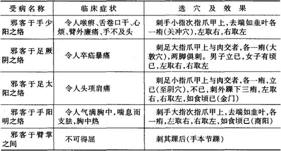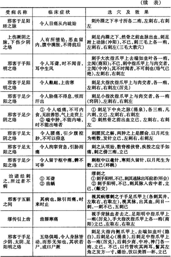 明代针灸医家杨继洲在《针灸大成》中引《素问·缪刺论篇》的记载,详细阐述了有关缪刺的意义,受病之络的临床症状和选穴及其效果,列表4-11介绍。