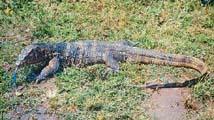 释义 | 巨蜥(Varanus salvator) 爬行纲,巨蜥科。 全长约2米。背鳞颗粒状,呈黑橄榄色,有不鲜明的黄色点状环纹;腹面淡黄色,腹鳞长方形,横行排列。尾侧扁,梢端尖细。多生活于近水处,能游泳,也能攀爬矮树。捕食蛙、蛇和小型鸟兽。分布于中国广东、海南、广西、云南等地;也产于印度、东南亚一带。为国家一级保护动物。 巨蜥 |