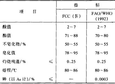 本品为浅棕色至浅黄色硬质脆性蜡,具有树脂状断面,微有气味,相对密度0.997,熔点80~86℃,碘值13.5。不溶于水,部分溶于乙醇,溶于氯仿和乙醚及40℃以上的脂肪,溶于碱性溶液。