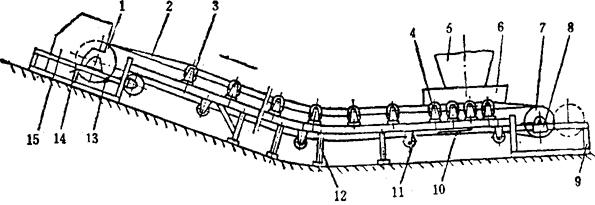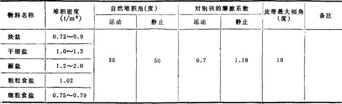 图2-8-36 带式输送机总体结构简图 1-传动滚筒 2-输送带 3-上托辊 4-缓冲托辊 5-漏斗 6-导料拦板 7-改向滚筒 8-螺杆张紧装置 9-尾架 10-空载段清扫器 11-下托辊 12-中间架 13-头架 14-弹簧清扫器 15-头罩 (一)带式输送机的使用 1.输送带 通用输送带有橡胶输送带和塑料输送带两种,盐业中目前普遍采用橡胶带。塑料输送带为整芯结构,由于表层为聚氯乙烯,输送散盐时均不采用。 橡胶带接头有硫化接头和机械接头。两种接头的强度分别为橡胶带自身强度的85~95%和35~40%。由于机械接头强度低,卡子易锈腐,接头处又容易泄漏细盐,在井盐区多采用硫化接头,机械接头逐步被淘汰。 2.给料和卸料装置的设置 给料装置最好设置在水平段;也可设置在倾斜段,当倾角大时,应适当减小倾角;不允许设置在曲线段内。 应均匀地向输送带中心供料,并尽量使物料与输送带同向有一初速度。物料落差大或供料不均匀时,应设缓冲挡板或篦子,以缓解对输送带的冲击。 (二)带式输送机设计计算 1.盐的物理特性(与带式输送机有关部分),见表2-8-24。 表2-8-24 盐的部分物理特性