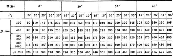 注:一般情况下,较长及水平的输送机可选择较高带速; 采用电动卸料车时,带速不易超过3.15m/s; 采用犁式卸料器时,带速不易超过2m/s; 人工配料称重时,带速约为1.25m/s; 手动时带速取0.2~0.3m/s。 ③输送能力计算 Q=RdRvRβVγB2 (t/h) (2-8-34) 输送能力可参考表2-8-30 表2-8-30 胶带输送机输送能力表