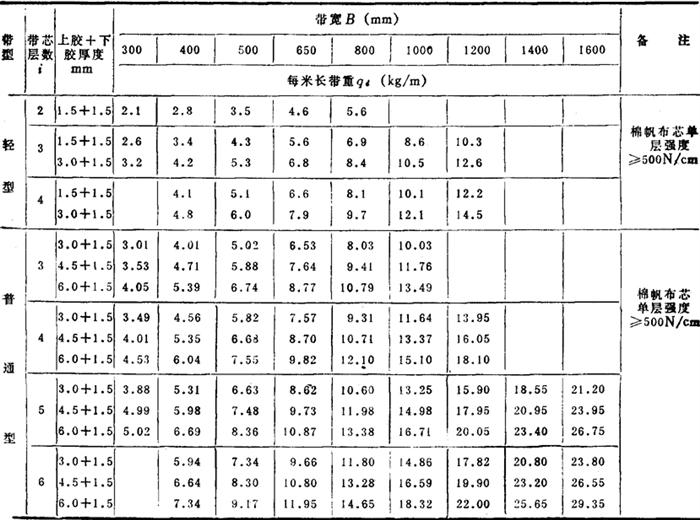 Q——输送能力(t/h) V——带速(m/s) γ——物料堆积密度(t/m3)见表2-8-24 求得B值后,根据带宽系列选取带宽,见表2-8-28。输送盐时上胶厚度可取3mm或1.5mm。 表2-8-28 橡胶输送带的规格