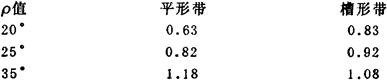 注:表中的输送量Q值,是在γ=1.0t/m3、C=1.0、ρ=30°时的计算值; γ值、C值改变,Q值应按比例增减: 动堆积角ρ改变,Q值应乘以下列系数: