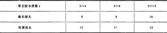 式中 Rq=1.0~1.4——满载起动系数,依电动机起动力矩大小及所用联轴器形式而定 η——包括传动滚筒轴在内的传动效率 N0——传动滚筒轴功率(kW) 4.其他参数的确定 (1)胶带层数按下式计算: