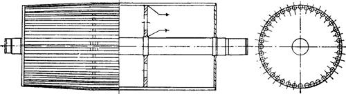 B——带宽(cm) σ——胶带径向单层扯断强度(N/cm),见表2-8-28 (2)张紧行程 棉芯输送带张紧行程 SZ=1%L(m) 棉维混纺芯输送带张紧行程 SZ=(1~1.5)%L(m) 维尼龙芯输送带张紧行程 SZ=(1.5~2)%L(m 钢绳芯输送带张紧行程 SZ=(0.2~0.3)%L(m) (3)传动滚筒直径和型式 ①滚筒直径 橡胶带式、塑料带式输送机硫塑化接头 橡胶带式、塑料带式输送机机械接头 橡胶带式、塑料带式移动输送机 钢绳芯带式输送机 式中 D——滚筒直径(mm) i——输送带层数 输送带为整芯时,i取厚度相等的多层芯带的层数。 ②滚筒型式 滚筒表面除采用光面、胶面两种外,当盐含水量较多时,为了防止打滑、跑偏、滚筒表面结盐,常在收盐机、堆坨机等设备上采用条状面滚筒(见图2-8-37)