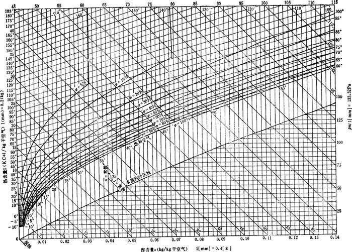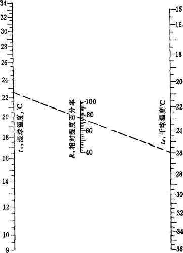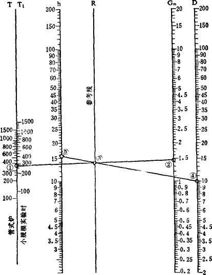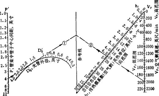 释义 | 常用图表 1.空气的焓湿图(图3-4-78)。 图3-4-78 湿空气的Ⅰ- 2.国内主要城市的干湿球温度值,见表3-4-93。 表3-4-93 我国主要城市每年超过5天和10天的昼夜平均干、温球温度值 3.空气和燃烧气垂直流经错列管束时的传热膜系数,见图3-4-79。 图3-4-79 空气或燃烧气垂直流经错列管束时的传热膜系数 基本依据 本图根据下列公式绘制成。 h=fGm2/3T0.3/D1/3 (3-4-80) 式中 h——传热膜系数〔kcal/(m2·h·℃)〕 T——气体的绝对温度(K) Gm——通过管束的气体最大质量流速,〔kg/(m2/s)〕(Gm=Vρ) D——管外径(cm) f——系数,管式炉时为4.41,小规模实验时为4.83 V——流速,(m/s) ρ——密度(kg/m3) 使用方法 在图3-4-79依次连接标尺T→Gm→R,R→D→h,即得所求之值。 例题 已知一个大气压(0.1MPa)的空气垂直流经外径为10cm的管子交错排列的管束进行加热,空气的平均温度为90℃,通过最狭窄处时的流速为1.5m/s,求空气侧传热膜系数。 (解)T=273+90=363K Gm=Vρ=1.5×0.975=1.46kg/(m2·s) 在图3-4-79上,将标尺T上363(右侧数字)和标尺Gm上1.46相连,与参考线R相交,将此交点和标尺D上10相连,并延长与标尺h相交,得交点h=15.5kca1/(m2·h·℃)。 4.空气流经翅片管表面的传热膜系数 基本依据 当两股流体的给热系数相差很大时,如用水蒸汽冷凝以加热空气等气体时,空气给热系数约为10,水蒸汽冷凝的给热系数达1000~2000,为达到换热要求,用加多换热管子数量来加大受热面积,显然是不经济的,采用换热管表面增加翅片的办法,既加大传热面积,又增强气体流动时湍动程度,提高了气体的给热系数。 用翅片加大换热表面时空气传热膜系数可用下式表示: hf=0.17〔(VF)0.6/(D′o)0.4〕〔P′/(P′-D′o)〕0.6 (3-4-81) 式中 hf——空冷器翅片管空气传热膜系数,(以总的加大后的表面积为准)〔英热单位/(英尺2·h·℉)〕 VF——空气侧速度(英尺/min) P′——管束中管中心间距(in) D′o——光管外径,(翅管根部直径)(in) 应用范围 可用于气体和液体的加热或冷却的翅片式换热。 已知换热翅片管的VF、D′o和P′值,用图3-4-80即可求得hf。为增加低速VF范围时的精确度,在标尺VF和标尺hf两侧都有刻度,使用时两标尺相对应地用。 图3-4-80 空气流经翅注管表面的传热膜系数算图 使用方法 按图3-4-80,依次连接标尺P′→D′o→R, R→VF→hf,即得所求之值。 例题 有一组翅片加热管,管子外径D′o=1.5in,管束管子中心间距P′=4in,空气流速为VF=200英尺/min,求管外空气侧传热膜系数。 (解)按图3-4-80将标尺P′上的4和标尺D′o上1.5相连,并延长与参考线R相交,将其交点和标尺VF上低值侧200相连,与标尺hf相交,在交点读低范围值得hf=4.6英热单位/英尺2·h·℉。 5.空气的相对湿度百分率 基本依据 空气的湿球温度与干球温度之差小于6℃时,两者温度与相对湿度百分率可用下式表示: R=〔(tW+10)/(td+10)〕3 (3-4-82) 式中 R——相对湿度百分率 tW——湿球温度(℃) td——干球温度(℃) 图3-4-81即根据上式绘制而成。 使用方法 已知空气的湿球温度及干球温度,用图3-4-81求相对湿度百分率时,连接标尺tW上的已知湿球温度及标尺td上的已知干球温度,在相对湿度百分率标尺R上读取所求数据。 例题 空气的湿球温度为22.5℃及干球温度为26℃,求相对湿度百分率。 (解)按图3-4-81中的断线所示,连接标尺tW上的22.5及标尺td上的26,在标尺R上读取74%,即为所求之值。 图3-4-81 空气的相对湿度百分率 |