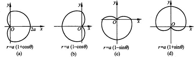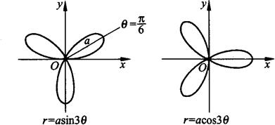 释义 | 常用曲线的极坐标方程及参数方程 圆的方程 r=R (圆心在极点,半径为R); r=2Rcosθ (圆心在x轴上且与 r=2Rsinθ (圆心在y轴上且与极轴相切). 双扭线方程及其图形(见图1.11) 图1.11 在直角坐标系中:(x2+y2)2-2a2(x2-y2)=0; 在极坐标系中:r2=2a2cos2θ. 摆线(或称普通旋轮线)方程及其图形 摆线的定义 定圆上-点M在直线上作不滑动的滚动的轨迹(见图1.12). 图1.12 摆线的参数方程: 星形线(或称m=4时的内摆线)的方程及其图形 星形线的定义 星形线是-圆周(直径为a)沿另-定圆(直径为4a即m=4)的内部不滑动而滚动时,圆周上-定点M所构成的轨迹(见图1.13). 图1.13 星形线的方程: 玫瑰线 1.心形线(见图1.14) 图1.14 2.三叶玫瑰线(见图1.15) 图1.15 3.蔓叶线(见图1.16):y2(2a-x)=x3. 图1.16 4.笛卡儿叶形线(见图1.17):x3+y3-3axy=0. 图1.17 |