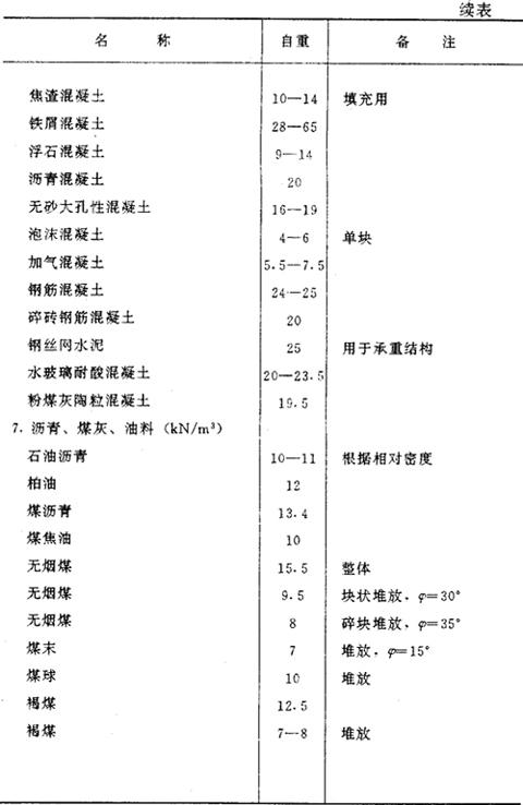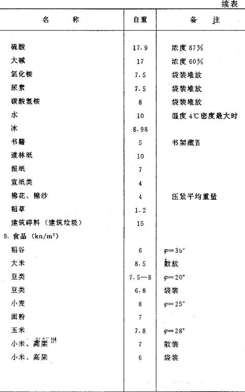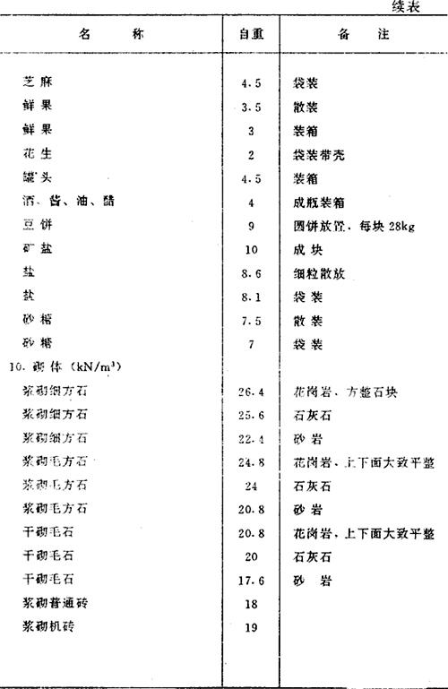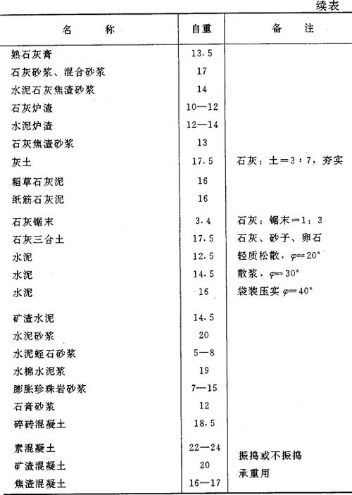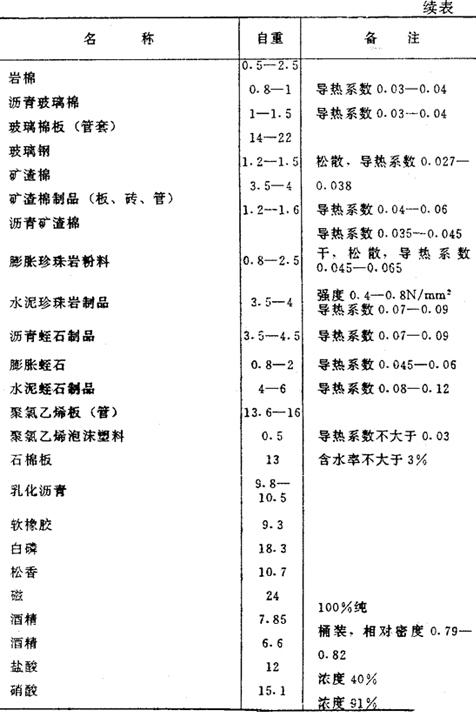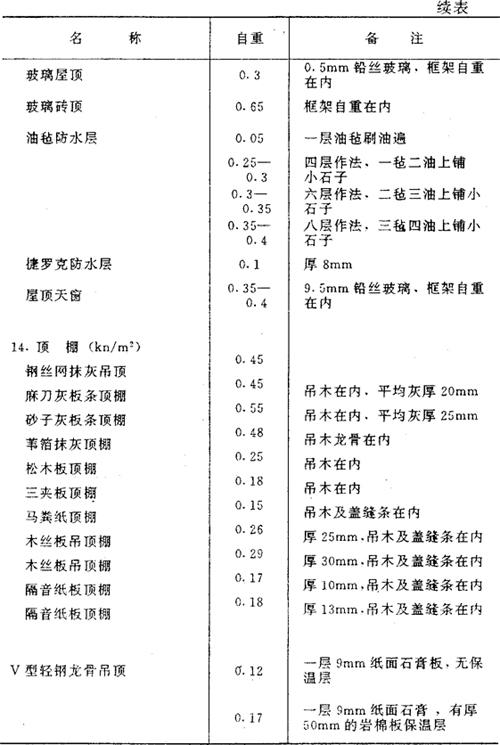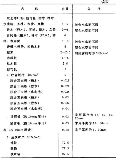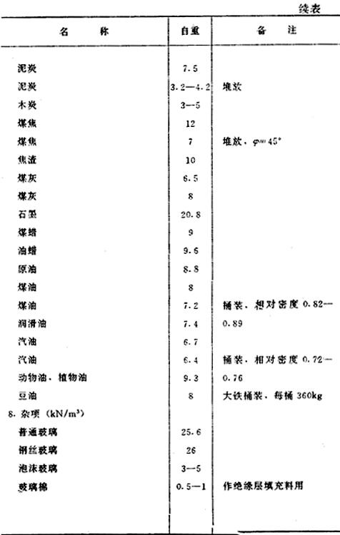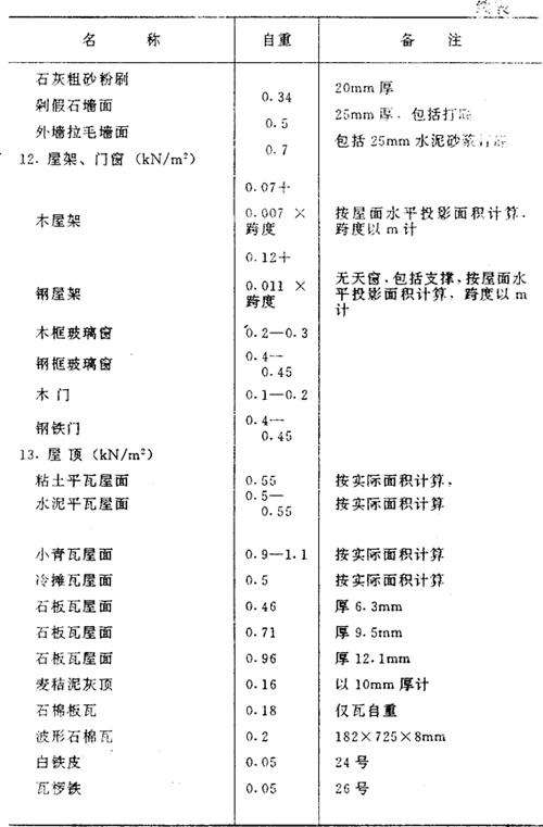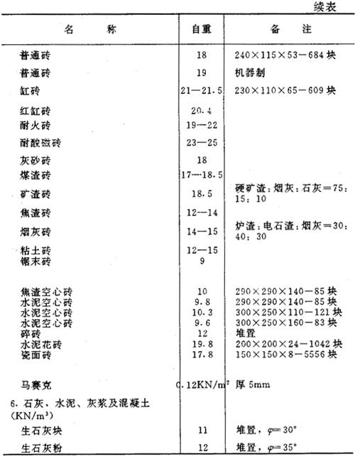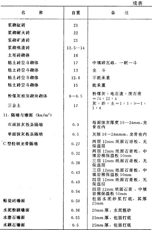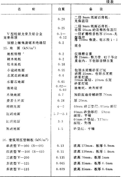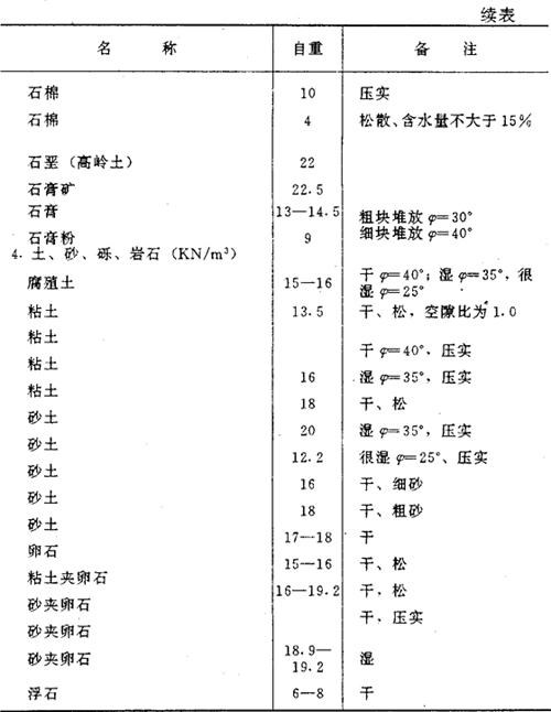 释义 | 常用材料和结构件自重与重量的换算 原《工业与民用建筑结构荷载规范》TJ9-74,进行了修订为《建筑结构荷载规范》GBJ9-87,原规范称材料重量(kg/m3),新规范称材料自重(kN/m3)。按法定计量单位计算。即 1kg=9.80665N≈10N=0.01kN 例如,原规定杉木400kg/m3,新规定为4kN/rn3。则400×0.01=4kN/m3(千牛顿每立方米) (以下计算类推) 表10-19 常用材料和构件的自重表 |