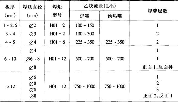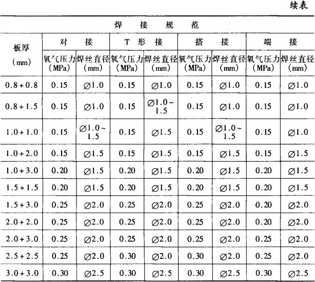 释义 | 常用材料的气焊 1.低碳钢气焊 低碳钢的可焊性良好,一般施焊时不用助熔剂,不需要焊前预热和焊后缓冷。低碳钢气焊主要用于薄板焊接,焊丝可采用H08、H08A、H08Mn、H15和H15Mn等。低碳钢焊接规范见表12-22。 表12-22 低碳钢气焊规范 2.低合金钢气焊 低合金钢的可焊性良好,焊接时一般不用助熔剂,可采用与低碳钢相同的焊接规范进行焊接。冬季焊前可用气焊火焰稍微预热焊接区,并适当增加定位焊点数量或长度,防止产生裂纹,焊丝可选用H08A、H08Mn、H08MnA。 3.中、高碳钢气焊 由于含碳量较高,可焊性较差,焊缝和热影响区易产生裂纹,同时,在焊接过程中由于碳的烧损,焊缝易产生气孔,焊缝强度、硬度有所下降。中、高碳钢气焊火焰能率比焊接低碳钢时应小10%~15%,以防止焊件过热。焊丝必须采用含碳量小于0.25%的低碳钢焊丝,如H08Mn、H08MnA、H10MnSi、H10Mn2等,不用熔剂,焊前可对焊件进行预热(温度为250~400℃),以提高焊接速度,降低冷却速度,防止产生淬硬组织。但薄板可以不预热,焊后应进行退火处理,即把焊件加热至700~800℃,然后空冷,可以改善焊缝金属组织,消除焊接内应力。 4.铝及铝合金气焊 铝及铝合金的气焊具有以下特点: (1)导热系数大,线胀系数和凝固收缩率较大,因此焊接变形大,易产生焊接裂纹。 (2)液、固状态颜色无明显变化,熔池温度不易控制。 (3)化学活泼性强,易氧化,形成的氧化膜熔点高,其相对密度同铝的相对密度非常接近,容易形成焊缝夹杂物。 (4)焊缝易产生氢气孔。 铝和铝合金气焊时用中性焰,不能采用碳化焰和氧化焰,以免焊缝金属增氢或氧化。一定要使用铝气焊熔剂(见表12-11和表12-16)。焊后必须彻底清除残渣。火焰能率应根据焊件厚度来选择,表12-23数据可供参考。 表12-23 铝及铝合金气焊规范 5.铜及铜合金的气焊 铜及铜合金的可焊性较差,其气焊特点如下: (1)铜及铜合金的导热系数大,因此焊接时要使用大功率的热源,通常在焊前或焊接过程中要采取预热措施。 (2)铜及铜合金线膨胀系数和收缩率较大,气焊时如无防止变形的措施,会产生较大变形。当工件刚性很大时,由于变形受阻,会产生较大的焊接应力,甚至产生裂纹。 (3)铜及铜合金气焊时,焊缝和近缝区易产生裂纹,其中主要是热裂纹。 (4)铜及铜合金气焊时,焊缝易产生氢气孔和水蒸气气孔。 紫铜气焊的规范见表12-24。焊接时采用中性火焰、右焊法,使用CJ301气焊熔剂和HS201或HS202焊丝。 表12-24 紫铜气焊规范 黄铜气焊规范见表12-25。焊接时采用轻微的氧化焰或中性焰、左焊法,在操作中应尽量避免高温焰心与熔池金属直接接触,以防黄铜中锌的氧化烧损和有害气体的溶解。焊接时应使用HJ301气焊熔剂和HS221、HS222、HS224焊丝。 表12-25 黄铜气焊规范 |