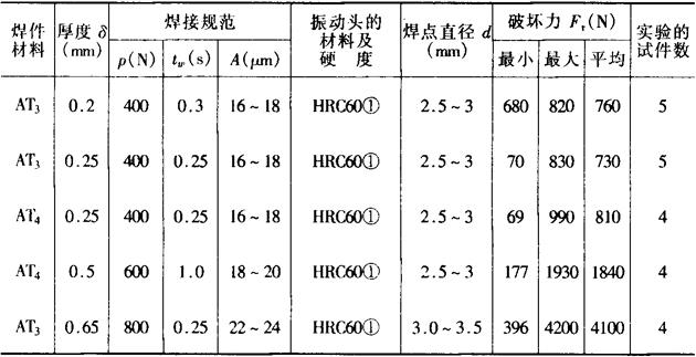 表7-52 铜T2的超声波焊接规范及焊点强度
