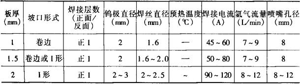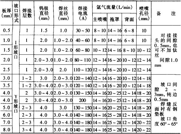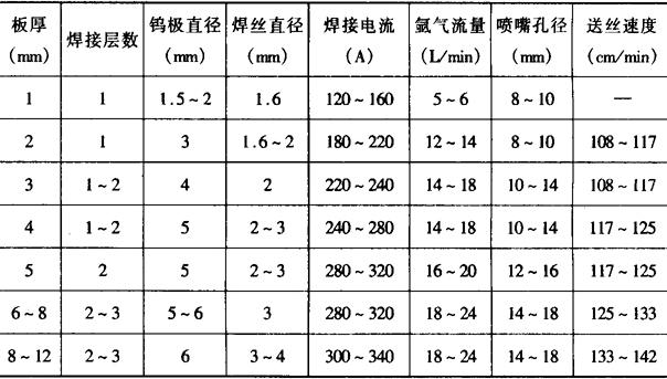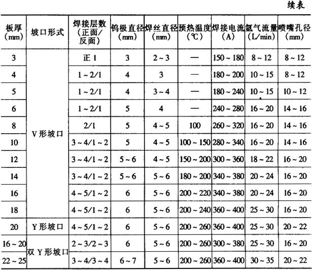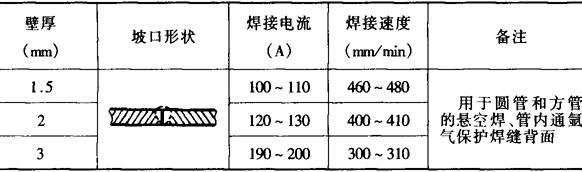 表5-8 纯铝、铝镁合金手工钨极氩弧焊(对接交流)规范 表5-9 铝及铝合金自动钨极氩弧焊(交流)规范 表5-10 不锈钢薄板手工钨极氩弧焊规范 注:①仅在无直流时可采用交流。 表5-11 钛及钛合金手工钨极氩弧焊(直流正接、对接)规范 表5-12 钛及钛合金自动钨极氩弧焊(直流正接、对接)规范 表5-13 奥氏体不锈钢管子钨极氩弧焊(悬空焊)规范 注:直流正接。 表5-14 不锈钢厚壁管多层焊时打底焊缝工艺参数 |