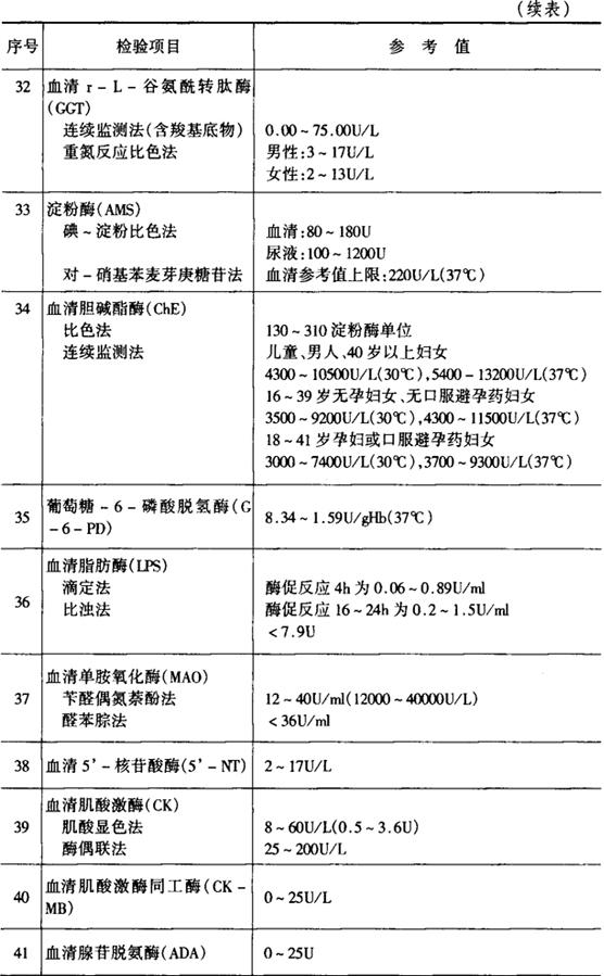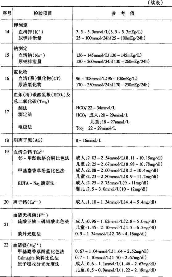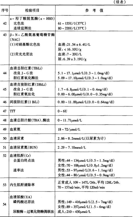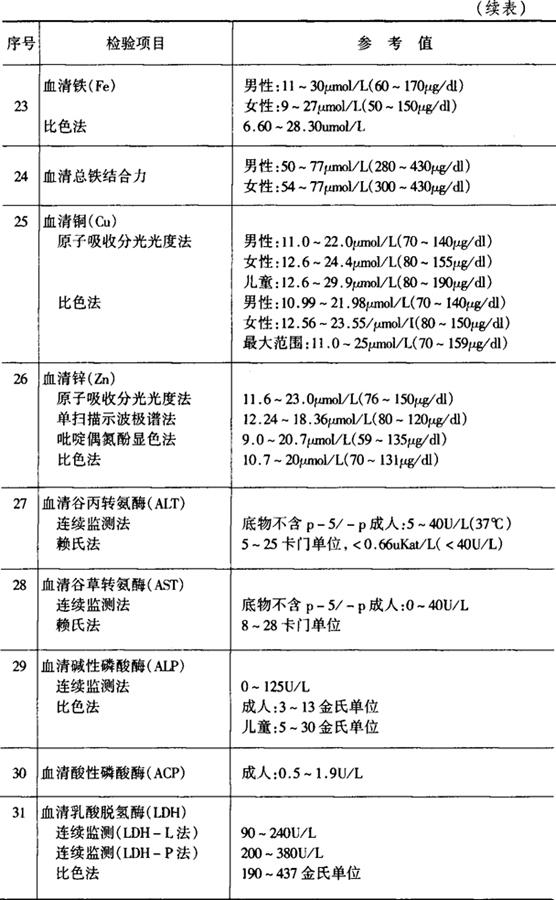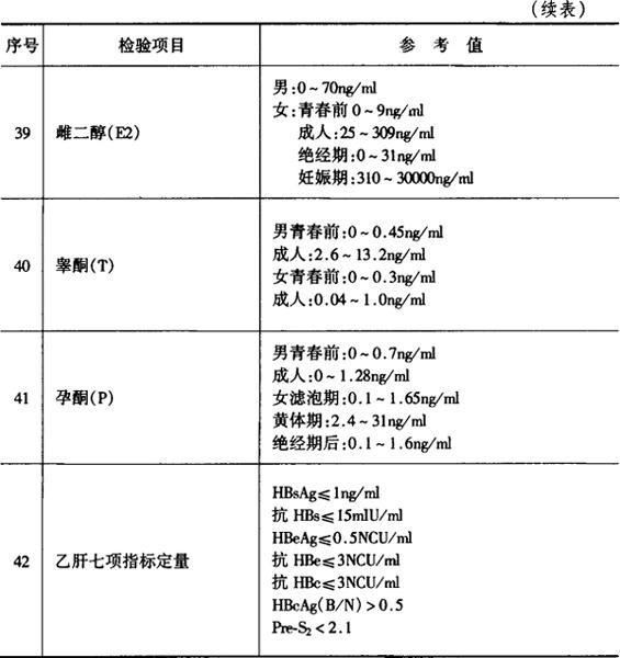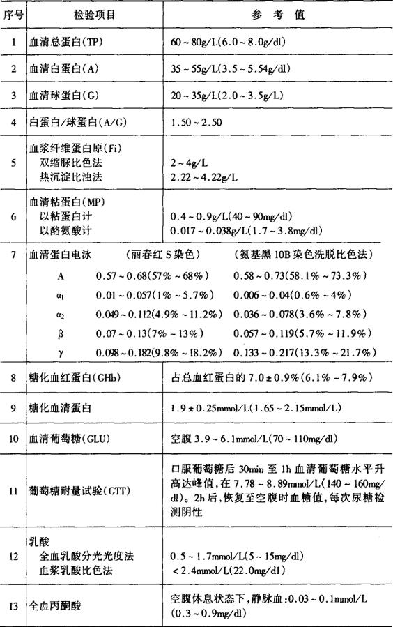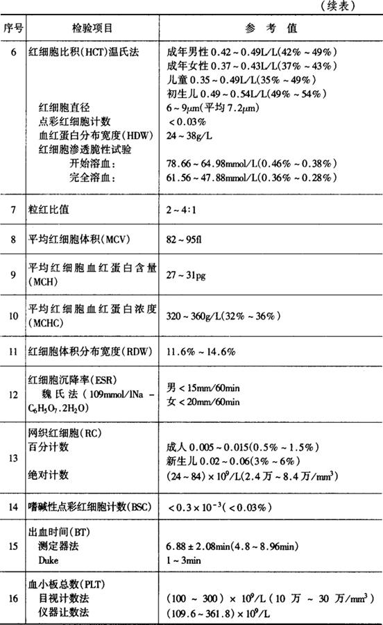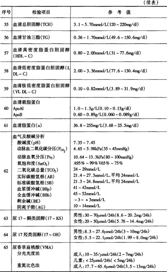 释义 | 常用检验项目正常参考值 常见检验项目正常参考值见表7-1~表7-4。 表7-1 血液学检验项目 表7-2 一般临床检验项目 表7-3 临床化学检验项目 表7-4 临床免疫学检验项目 注:NCU:中国国家临床检验中心单位;B/N:测定值/阴性值。 |