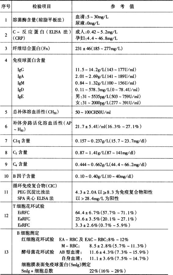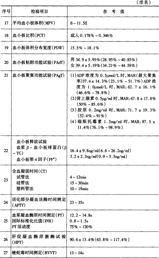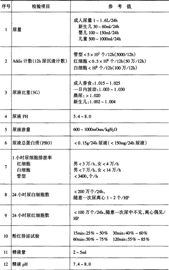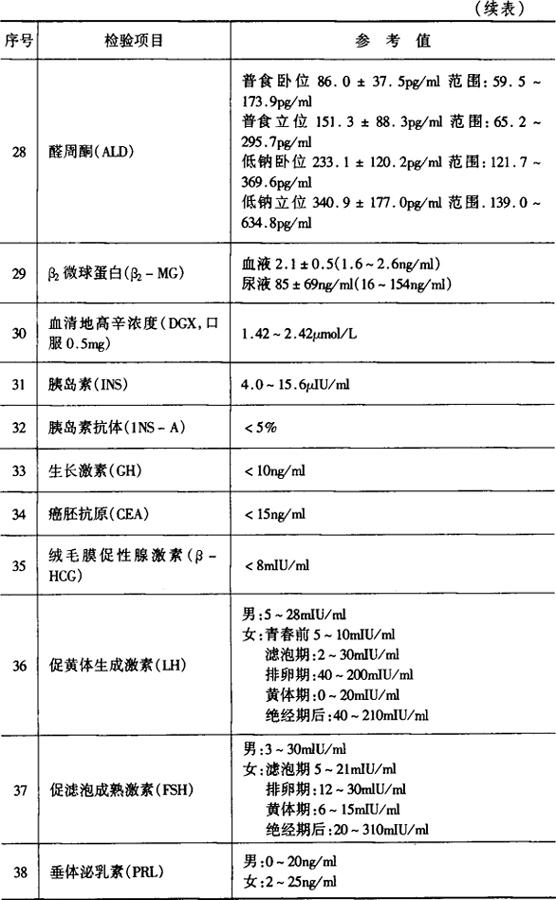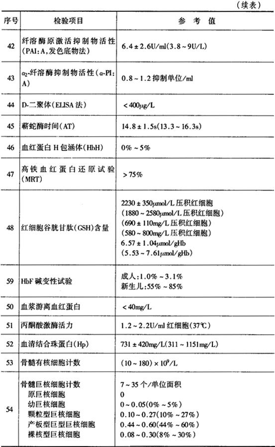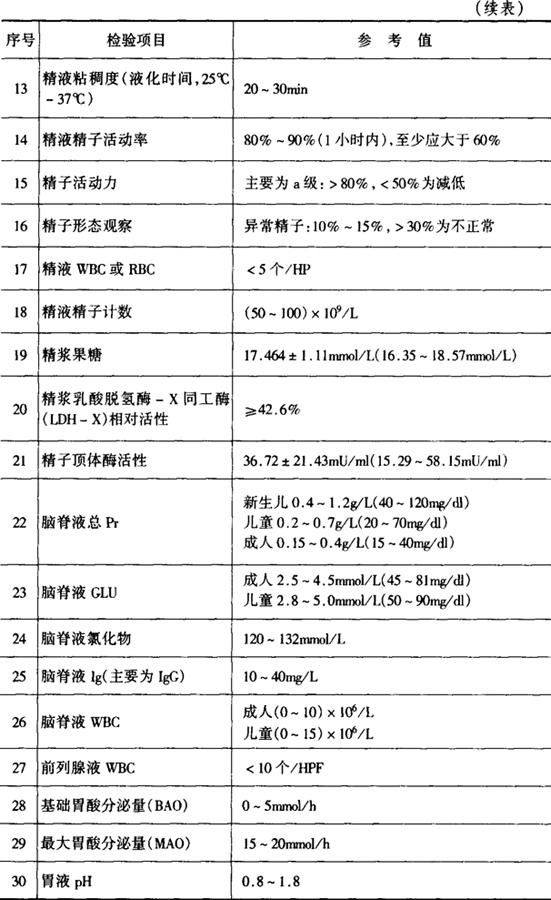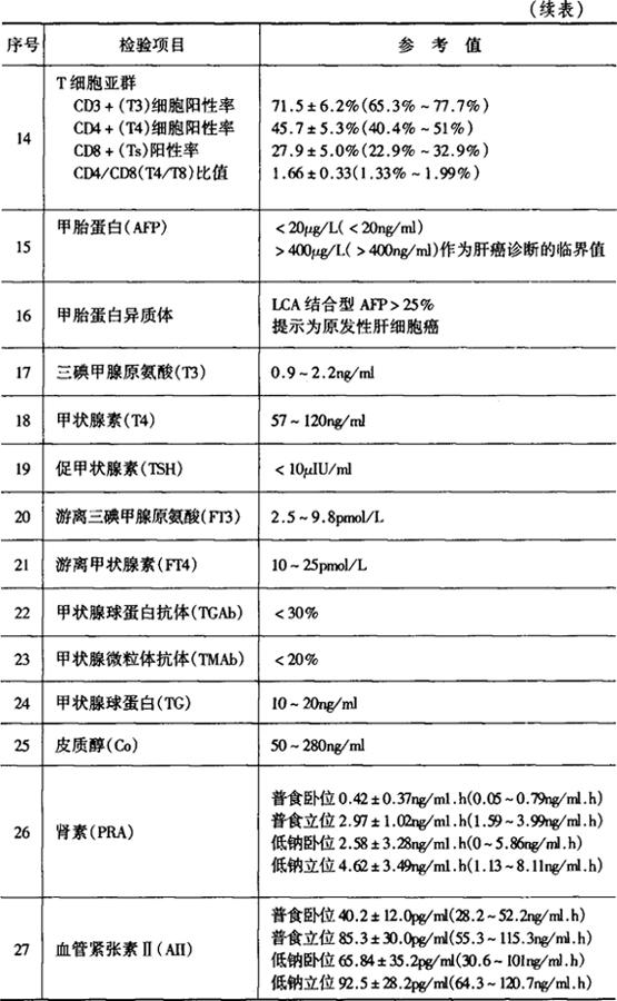 释义 | 常用检验项目正常参考值 常见检验项目正常参考值见表7-1~表7-4。 表7-1 血液学检验项目 表7-2 一般临床检验项目 表7-3 临床化学检验项目 表7-4 临床免疫学检验项目 注:NCU:中国国家临床检验中心单位;B/N:测定值/阴性值。 |