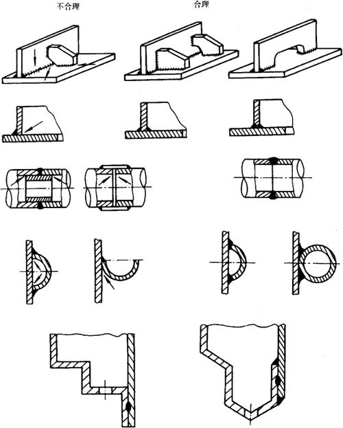 释义 | 常用焊接接头设计注意事项 1.接头的可焊到性 熔焊接头焊接时,为保证获得理想的接头质量,必须保证焊条、焊丝或电极能方便地到达欲焊部位。图13-38中,箭头所指部位难以焊到,为不合理设计。 图13-38 电弧焊接头的合理与不合理设计 电阻焊(点焊、缝焊)接头设计时,必须考虑电阻焊机的机臂长度和电极尺寸,图13-39为电阻焊接头的设计实例。 图13-39 电阻焊接头的设计建议和典型尺寸限度 A=对于钢件小于76,对于铝合金件小于102 ①受点焊机机臂长所限 ②不适用于缝焊或滚点焊 2.接头的可探伤性 接头的可探伤性是指接头检测面的可接近性和几何形状与材质的探伤的适宜性。而几何形状和可接近性对探伤的灵敏度和结果有重大影响。图13-40左侧所示接头是无法射线探伤的,探出结果不准确,右侧的接头形式,则是可以射线探伤的、 图13-40 考虑射线探伤的熔焊接头设计 (左边不好,右边好,箭头为射线照射方向) 3.考虑接头腐蚀的设计注意事项 腐蚀介质与金属表面直接接触时,在缝隙内和尖角处常常发生强烈的局部腐蚀。防止和减小的方法是:设计时避免接头缝隙及其形成尖角和结构死区,要便于清洗和排放污物,尽量采用对接接头,焊接时要焊透。如图13-41所示,左图为不合理设计结构,右图为改进后的合理设计。 图13-41 考虑缝隙腐蚀的接头合理与不合理设计 |