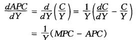 式中,APC表示平均消费倾向,C和Y分别表示消费和收入。根据消费函数,C是收入Y的函数,所以APC也是Y的函数。APC曲线的形状,取决于边际消费倾向(MPC)和平均消费倾向(APC)差额的大小,即: