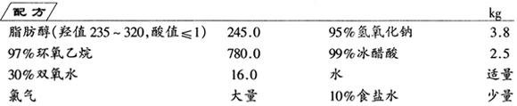 通入氮气数分钟,驱尽釜内空气。停止抽真空,升温到150℃,逐渐通入环氧乙烷,并保持0.1~0.2MPa的压力,控温在160~180℃。当环氧乙烷通入量接近750kg时,抽样测浊点,如1%活性物在10%氯化钠溶液中浊点达75以上时,即可停止。