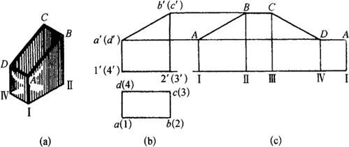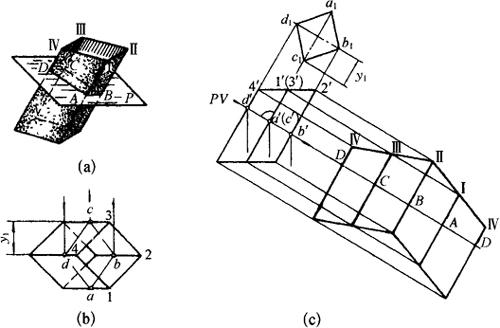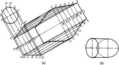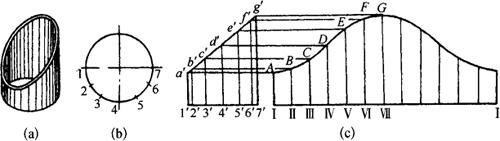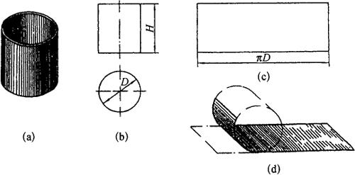释义 | 平行线法 钣金制件的侧面是棱柱面或圆柱面所围成时,这种制件的表面系可展表面。若由于棱柱的侧棱和圆柱面的素线在空间互相平行,沿制件表面的侧棱或素线将制件侧面剪开,然后将侧面沿着与棱柱或素线所垂直方向依次摊平在一个平面上,所得表面(侧面)的展开,其各棱线或各素线仍然互相平行。作展开图时,可利用这种平行特性来绘制制件表面展开图,其所得到的展开图上各棱线或素线仍然平行。 这种根据平行线原理绘制展开图的方法,称为平行线法。应用平行线法画制件表面的展开图,关键是找出这些互相平行的棱线或素线的间距,以及各自的长短。 1.棱柱管展开图的作法 【例1】 图3-15(a)、(b)为斜口直立四棱柱管及其主、俯视图,作其展开图。 图3-15 斜口直立四棱柱管的展开图 (1)分析 斜口直立四棱柱管的前后侧面为梯形正平面,正面投影为实形;左右侧面为矩形侧平面,侧面投影为实形(图中未作出)。画展开图时,即把这些实形依次画出。由于四条侧棱都是铅垂线,正面投影反映实长;底面四边形各边是水平线,水平投影为实长。因棱线和底面垂直,展开后各侧棱必垂直对应的底边。 (2)作图[图3-15(c)] ①过底面作一水平线(底边线),并依次截取Ⅰ Ⅱ=(1)(2)、Ⅱ Ⅲ=(2)(3)、Ⅲ Ⅳ=(3)(4)、Ⅳ Ⅰ=(4)(1)。 ②过点Ⅰ、Ⅱ、Ⅲ、Ⅳ、Ⅰ作垂线,截取各棱线实长(ⅠA=1′a′,ⅡB=2′b′……)或由主视图引底边线的平行线(水平线),得点A、B、C、D、A。 ③顺序把A、B……各点连线,得斜口直立四棱柱管展开图。 【例2】 图3-16(a)、(b)为斜口四棱柱管及其主、俯视图,作其展开图。 图3-16 斜口四棱柱管的展开图 (1)分析 从图中可看出,斜四棱柱管的四条棱线Ⅰ、Ⅱ、Ⅲ、Ⅳ为正平线,正面投影为实长;上下底面平行H面,底面各边是水平线,水平投影为实长。但因棱线与底面不垂直,因此,不宜直接作展开图。这时,假设在适当位置作一与棱柱的侧棱垂直的正垂面P,其正面投影积聚一直线PV。用换面法将棱线变换成新投影面的垂直面,并求出正垂面P与斜四棱柱的截断面实形(四边形a1b1c1d1),这四边形的各边与棱线垂直,可把斜四棱柱视为两节斜口直立四棱柱(与图3-15相同),从而可用该图示方法作图。 (2)作图[图3-16(b)、(c)] ①作正垂面P的正面投影积聚斜线PV及定出各棱线与P面交点a′、b′、c′和d′。再求得水平投影abcd,若顺序连线,得截断面四边形各顶点abcd的水平投影。 ②运用换面法(用与侧棱垂直新投影H1面代替H面,图中未画出新投影轴),求得点a1、b1、c1和d1,并顺序连线得a1b1c1d1四边形,它是截断面ABCD的新投影,各边反映相邻棱线的间距。 ③用图3-15作图方法画出四个棱面的展开图。先把PV斜线延长,并截取DC=d1c1、CB=c1b1……得点D、C、B、A、D;分别过这些点作垂线,并在各垂线上截取相应棱线的实长,如DⅣ=d′4′,CⅢ=c′3′……或过棱线的端点1′2′3′4′引PV的平行线与相应棱线相交,得点Ⅰ、Ⅱ……把各点顺序连接,得斜四棱柱管的展开图。 2.圆柱管展开图的作法 圆柱面可看成由内切正棱柱的底面边数无限增多而形成。圆柱面上各素线互相平行,因此,圆柱面展开也可用平行线法,并按直棱柱面展开方法作图。 【例3】 如图3-17所示,直圆柱面的展开图为一矩形,底边的长度等于圆柱管的圆周长πD,高为圆柱管的高度。 图3-17 圆柱管的展开图 【例4】 如图3-18所示,已知斜口直圆柱管的主、俯视图,求作展开图。 图3-18 斜口圆周的展开图 (1)分析 斜口直圆柱管是直圆柱管被正垂面斜截而形成的。截平面与圆柱面的截交线为椭圆线,圆柱面上素线长短不一,由于圆柱轴线垂直H面,各素线的正面投影为实长。 画展开图时,将底圆展成直线,过直线上各等分点作垂线(素线),并截取素线上相应长度得其端点,并连成光滑曲线。 (2)作图[图3-18(b)(c)] ①把俯视图圆周等分为12等份(等份越多越准确),过各等分点找出主视图上相应素线1′a、2′b…… ②将圆周展成直线,截取相应12等份弧长,近似作图以弦长代替弧长Ⅰ Ⅱ=12,Ⅱ Ⅲ=23……得等分点Ⅰ、Ⅱ、Ⅲ……过各点作垂线,并在垂线上截取相同素线等长的线段ⅠA=1′a′,ⅡB=2′b′……(或过主视图上点a′、b′……引水平线与相应素线相交),得各素线端点A、B…… ③过各素线的端点A、B、C……顺序连成光滑曲线,即得所求,见图3-18(c)所示。 应当指出用弦长代替弧长作出的展开图,其底边长度缩小,产生一些误差,是一种近似作图。由于钣金制件有的要求不需很准确,用这种方法可达到要求,作图简便,所以较为常用。有时为了把误差控制在一定范围内,要提高制件精确度,可增加圆周等分数,缩小素线之间的误差。若还需更为准确作图,应先计算出圆周长πD的尺寸作直线,再进行等分,这样作出的展开图较为准确。 通过上述两例的作图可得出结论如下:当圆柱的轴线与底面垂直时,底圆展开为一直线,并与素线垂直。 【例5】 如图3-19所示,已知两端斜口圆柱管的主、俯视图,作其展开图。 图3-19 两端斜口圆柱管的展开图 *该曲线为正弦曲线 (1)分析 从图中可知两端斜口圆柱的轴线是正平线,圆柱面素线正面投影为实长,但它们均不与端面(底面)垂直,所以采用图3-16所示方法作图。 (2)作图 ①在主视图的对称位置作N-N线(正垂面N的积聚投影)垂直轴线,并用换面法求得截面圆的实形,在该圆周上等分(12等份)得点1、2…… ②过等分点作斜圆面素线11′、22′……得素线