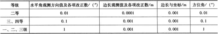 ρ″=206265。 3)三边网角条件,包括圆周角条件与组合角条件自由项的检核按下式计算限差: 式中 mD——观测边的平均测距中误差(mm); a——圆周角条件或组合条件方程式的系数。 3.导线测量的检核 1)按左右角观测的三、四等导线测量的测角中误差按下式计算: 式中 △——测站圆周角闭合差(″); n——测站圆周角闭合差的个数。 2)以导线方位角闭合差计算测角中误差按下式计算: 式中 fβ——附合导线或闭合导线环的方位角闭合差(″); n——计算fβ的测站数; N——附合导线或闭合导线环的个数。 4.GPS静态相对定位测量成果的检核 (1)同步观测量成果的检核 1)三边同步环的闭合差的限差按下式计算: 2)多边同步环闭合差的限差下按式计算: 式中 WX,WY,WZ——各坐标差分量的闭合差; σ——相应等级规定的精度(按平均边长计算); n——闭合环的边数。 (2)不同时段观测成果的检核 1)同一边任何两个时段的成果互差,应小于接收机标称精度的 2)若干个独立观测边组成闭合环时,各坐标差分量闭合差应符合下式规定: 式中 WX,WY,WZ——各坐标差分量的闭合差; σ——相应等级规定的精度(按平均边长计算); n——闭合环的边数。 5.平差计算 二、三、四等和一、二、三级平面控制网都应分级进行统一平差或联合整体平差。平差后应进行精度评定。 6.计算取位 平差计算和数据处理的数字取位应符合表17-10的规定。 表17-10 平差计算和数据处理的数字取位 |