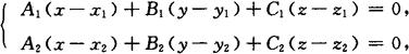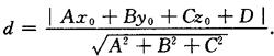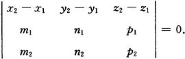 释义 | 平面方程的各种形式 平面方程的一般式 Ax+By+Cz+D=0, 其中A,B,C不同时为零,垂直平面的一个法向量n={A,B,C}. 平面方程的点法式 设平面过一定点(x0,y0,z0),其法向量为n={A,B.C},则其平面方程为 A(x-x0)+B(y-y0)+C(z-z0)=0. 称为平面的点法式方程. 截距式方程 该平面过三点(p,0,0),(0,q,0),(0,0,r),且p·q·r≠0.p,q,r分别称为平面在x,y,z轴的截距. 平面方程为x,y,z之间的一次方程,反之也成立 平面过不在一条直线上的三个点的方程 设M1(x1,y1,z1),M2(x2,y2,z2), M3(x3,y3,z3)不在一条直线上,则过M1,M2,M3的平面方程为 两平面间的夹角(指不超过π) 设平面A1x+B1y+C1z+D1=0及A2x+B2y+C2z+D2=0,则其夹角θ为 直线方程的各种形式 (1)直线的一般式方程 其中x,y,z的系数不成比例. 与L平行的直线的方向向量l为 (2)直线的对称式方程 设直线L过定点(x0,y0,z0),其方向向量l={m,n,p},则L的方程为 这一形式称为对称式方程.当分母为0时,应理解是分子为0. (3)直线的参数式方程 设直线L过点(x0,y0,z0),其方向向量l={m,n,p},则L的方程为 此形式称为参数式方程. 两直线间的夹角(指不超π的) 设两直线的方向向量分别为l1={m1,n1,p1},l2={m2,n2,p2},则它们间的夹角θ为 直线与平面的夹角 设直线的方向向量为l={m,n,p},平面的法向量为n={A,B,C},则它们夹角的正弦(见图8.4)为 图8.4 点到平面的距离 设定点(x0,y0,z0),平面方程为Ar+By+Cz+D=0,则点到该平面的距离d为 平面束方程 设平面π1:A1x+B1y+C1z+D1=0,平面π2:A2x+B2y+C2z+D2=0,则过π1与π2的交线的所有的平面方程称为平面束方程,其方程为 λ(A1x+B1y+C1z+D1)+μ(A2x+B2y+C2z+D2)=0, 其中λ,μ为不同时为0的实数. 点到直线的距离 设定点为A(x0,y0,z0),直线方程为 M=(x1,y1,z1)在直线上,则(x0,y0,z0)到该直线的距离d(见图8.5)为 图8.5 其中l={m,n,p}. 两条直线间的垂直距离 设直线L1的方向向量为l1,直线L2的方向向量为l2,M1,M2分别为L1,L2上一个定点.则L1与L2间的垂直距离d为 两直线的垂直方程 设直线L1与L2的方程分别为 则两直线的方程为 其中 两条直线共面的条件 设L1的方程为 L2的方程为 则L1与L2共面的条件是 四点共面的条件 设M1(x1,y1,z1),M2(x2,y2,z2),M3(x3,y3,z3),M4(x4,y4,z4),则M1,M2,M3,M4共面的条件是 |