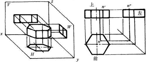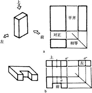释义 | 平面立体投影 平面立体包括长方体、棱柱体、棱锥体等外形,是由规则平面组成的简单的几何体,是构成组合体的基本形体。在投影图上表示平面立体就是把围成立体的平面及其棱线表示出来,然后判断其可见性,把看得见的棱线的投影画成实线,看不见的棱线的投影画成虚线。 (一)长方体的投影 最简单的平面体是长方体,它的表面由6个长方形围成,相对表面相互平行,相邻表面相互垂直。画其三视图时,使视线正对前面,先画主视图,然后按长对正画俯视图,最后按高平齐、宽相等画左视图,如图4-8a所示。 图4-8b所示的缺口长方体,应先画俯视图,即先把顶面、底面和缺口的真实形状和尺寸表示出来,再根据长对正的规律和长方体的高,画出主视图,最后根据高平齐、宽相等的规律画出左视图。在此例中,由于从左向右看时缺口被遮住,所以左视图上画虚线。 图4-8 长方体及其三视图 a.长方体 b.缺口长方体 长方体三视图的特点是每个视图表示一个面的实形,线框的4条边表示4个面的位置。 (二)六棱柱的投影 图4-9为六棱柱及其三视图,该六棱柱的顶面和底面为正六边形。将顶面和底面平行于水平投影面。主视图上的3个长方形线框是六棱柱6个侧面的投影,中间线框为前后侧面的重合投影,表示真实形状,左、右两个线框为其余4个侧面的重合投影,仅是类似形,顶面和底面积聚成上、下两条线。俯视图表示顶面和底面的真实形状,左视图中的两个长方形线框表示4个侧面的类似形状。 图4-9 六棱柱及其三视图 |