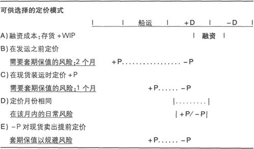 | 释义 | 年度合约中的定价条款 根据双方协商的具体定价条款,在年度或长期供应合约中,定价操作会在货物发运之前的几个月或运达之后的几个月才开始执行。因此,购买和销售之间定价的间隔时间会是几个月,反之亦然。 孤立地看,金属在这段时间间隔中是存在风险的。但通过成功的谈判,也许这段间隔本身就会为在LME的套期保值提供额外的获利。定价条款将通过减少存货的融资成本和产品的加工费用等途径,获得在金属以原料形式被运入和以成品形式被运出这段时间中的期货升水。 目的 强调不同的现货定价模式。 假设条件 同前例。 例