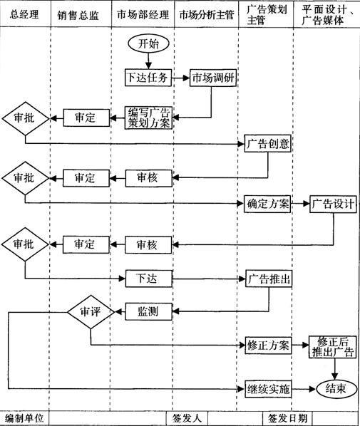 释义 | 广告策划流程 说明: 1.下达任务 (1)市场部经理根据公司年度经营计划,制定市场部年度工作计划。 (2)将工作计划下达给本部门相关人员,组织实施。 2.市场调研 (1)市场分析主管根据市场部的年度工作计划,进行市场调研。 (2)编写市场调研报告,上报市场部经理。 3.编写广告策划方案,审批 (1)市场部经理根据市场调研报告,组织编写广告策划方案。 (2)将广告策划方案上报销售总监进行审批,销售总监签署意见后上报总经理审批。 (3)总经理将审批合格后的广告策划方案下发市场部执行。 4.广告创意 (1)广告策划主管根据审批合格的策划方案及市场调研报告,进行广告创意设计。广告创意方案包括:广告设计的艺术创意、可行性、价格等内容。 (2)广告创意方案完成后,呈报部门经理进行审核,再上报销售总监进行审定,由总经理进行最后审批。 5.审批 (1)总经理根据年度市场销售计划对广告创意方案进行审批,并签署自己的意见。 (2)将审批合格的广告创意方案及自己的意见下发至市场部进行调查研究,并最终确定创意方案。 6.确定方案 (1)广告策划主管根据总经理的批示,确定设计总体方案。 (2)根据方案,组织平面设计人员与广告媒介部共同进行广告设计。 7.广告设计 (1)平面设计人员及广告媒体部门根据广告策划方案进行广告设计。 (2)广告设计包括:制定广告设计方案、广告推出、宣传策划等详细说明。 8.审批 (1)将广告设计送交市场部经理审核无误后,报销售总监审定,并签署自己的意见,由总经理对广告设计方案进行最后审批。时限:审核后,三日内送交市场总监;审定后,当日送交总经理。 (2)总经理审批合格后,签字,下发市场部经理。时限:审批合格后,当日下发。 9.实施 (1)市场部经理按照审批合格的广告设计方案,组织推广,实施广告设计方案。 (2)平面设计人员与广告媒体部门按确定后的广告方案,进行广告制作与宣传,并及时将广告推出。 10.监测 (1)市场部对已推出的广告进行监测,监测内容包括:广告方案的实施效果、广告反馈结果等。 (2)根据监测结果,编写广告实施效果调查报告,上报销售总监、总经理审评。 11.审评 (1)销售总监及总经理对上报的广告实施效果调查报告进行审评,并签署意见。 (2)若对上报的广告实施效果调查报告有修改意见,则下发市场部进行修正。时限:评审后,一日内下发销售部门。 12.修正方案 (1)广告策划主管组织平面设计人员及广告媒体部门对广告设计方案进行修正。 (2)将修正后的广告设计方案及时推出。 13.继续实施 若销售总监及总经理对上报的《广告实施效果调查报告》不抱异议,则下发市场部进行实施。 |