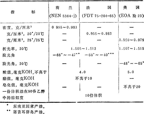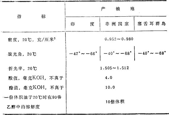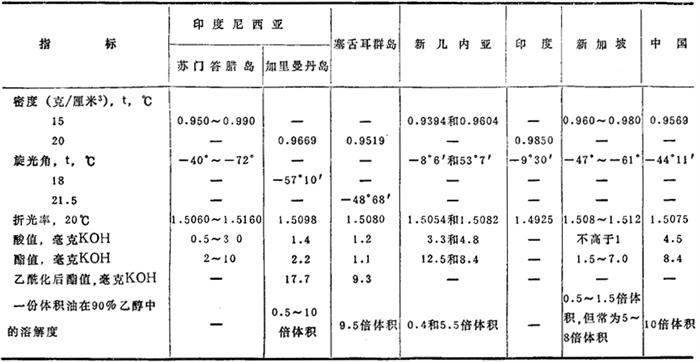 广藿香油的主要生产集中在爪哇岛、塞舌耳群岛和马达加斯加岛。 根据各国标准,各地生产的广藿香油质量应符合表31.3和31.4中列出的要求。 表31.3 根据各国标准广藿香油的质量指标