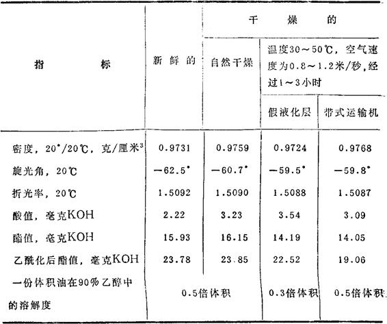 苏联产的广藿香油性质如下: 密度,20°/20℃,克/厘米3 0.950~0.975 折光率,20℃ 1.506~1.520 旋光角 -45°~-70° 含醇量(采氏法),% 45~70 表31.2中列有广藿香油的性质与原料的形式及干燥方法之间的关系。 表31.2 根据原料的情况广藿香油的物理化学指标