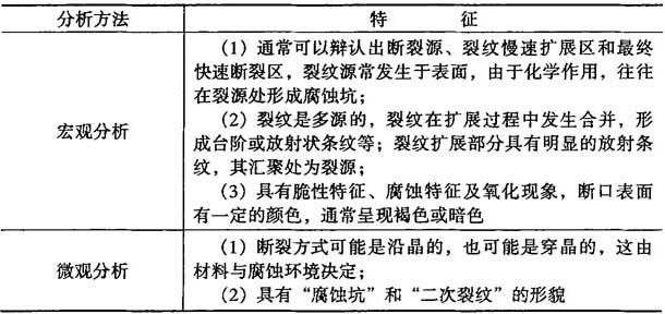 应力腐蚀断裂是金属构件在拉应力(或残余拉应力)和腐蚀介质联合作用下,产生裂纹,且裂纹不断扩展,最后导致断裂破坏的过程.破坏应力远低于金属屈服点.应力腐蚀失效的断口特征见表11-52