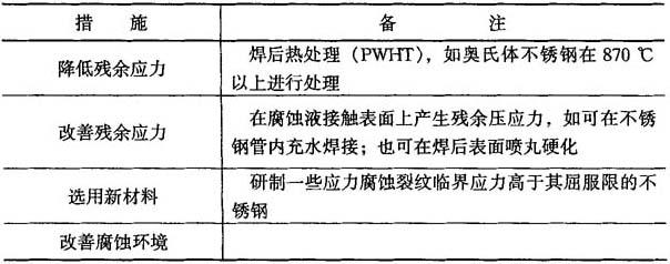 调查奥氏体不锈钢制设备应力腐蚀裂纹事故,结果表明80%的裂纹件数是由弯曲成形加工及焊接残余应力造成的(表11-54),其原因在于奥氏体钢的焊接区存在着相当于材料屈服强度大小的残余应力,该残余应力大于应力腐蚀裂纹临界应力.表11-55给出了防止应力腐蚀失效的措施.