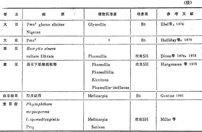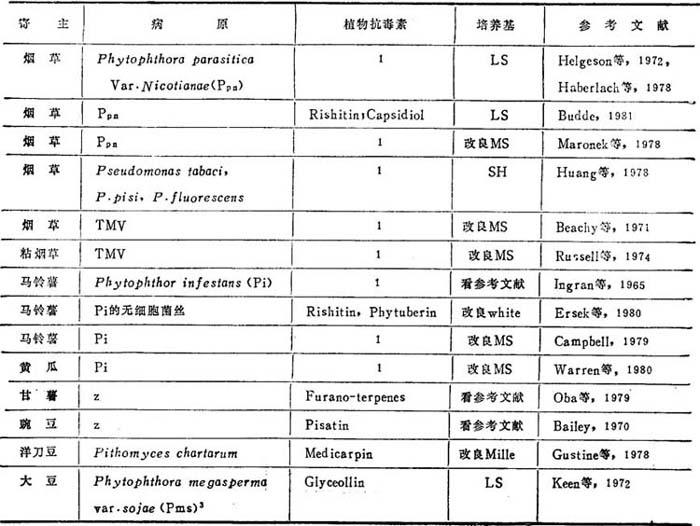 释义 | 应用 (一)组织培养系统中抗病性的表达 烟草/Phytophthora parasitica Dast.var.nicotianae(Bveda de Haun)(Ppn)系统是已经被很好地确定了的,它为离体培养系统应用于寄主与寄生菌相互作用研究的可行性提供了最好的证据,一个显性基因因子决定了烟草对Ppn的O小种产生的单基因抗性,这种因子在组织培养中得到了表达,Helgeson等(1976)把由185个烟草植株切根与其产生的愈伤组织进行观察比较对PpnO小种的抗性反应。供试植株的切根,分别来自纯合有抗性亲本,纯合敏感亲本,这些亲本杂交得到的F1,敏感和抗性的植株分别自交产生的S1植株,由F1自交得到的F2植株,纯合的敏感植株与杂合的抗性F2植株杂交产生的F3,以及F1植株与从栽培品种Wisconsin38产生的敏感植株的异交后代。在每种情况下的分离模式,反映了对PpnO小种产生抗性的显性单基因因子的存在。此外,从有抗性植株来的愈伤组织具有抗性,而从敏感植株来的是敏感的。既然这些植株和由其得到的愈伤组织对Ppn的O小种的反应总是一致的,那就证明在整体植株中表达的抗病基因在组织培养中也能表达。在组织培养中数量遗传对Ppn的抗性也得到了表达。Deaton等(1982)发现由田间(水平)抗性的burley栽培品种植株产生的愈伤组织对Ppn的反应是与整体植株对病原菌的反应高度一致的。这些愈伤组织的抗病能力处于单基因抗性与敏感性之间。 烟草愈伤组织培养体的抗性表达是受好几个因子影响的:包括温度、接种浓度、愈组织形态学,特别是培养基中的植物激素的平衡。有抗性反应的愈伤组织在接种点以下表现出过敏反应,伴随着由病原体引起的克隆化减少。在敏感组织中没有观察到任何过敏反应,在接种后七天内有广泛的克隆化。细胞学研究表明,在接种后的48h内,抗性组织中只有5-8层细胞被穿过,而在敏感组织中则有50多层细胞被克隆了。在组织培养中,亲和的和不亲和的互作中的亚显微结构变化,明显地相似于受Ppn感染的完整根中的变化。 在组织培养中抗性的小种专化性的表达,通过马铃薯对Phytophtlrora infestams(Mont)的反应,也得到了证明。由品种Majestic来的组织培养复合体,没有任何已知的抗P.infestans的R基因,能促进病原菌小种4的生长,而由品种Orion来的含有R1基因的复合体则不起促进作用。茄属的另一些抗小种4系来的组织培养复合体也具有抗性。而那些敏感系来的也是敏感的。因此,Ingram(1967)得出结论,抗P.infestans的R基因在茄属的组织培养体中得到了表达。如同烟草/Ppn系统中,马铃薯愈伤组织中抗P.infestans的基因的表达,也受培养基中生长调节剂平衡的影响。通过调节培养基中的生长素/细胞分裂素的比例,Campbell(1979)能够证明愈伤组织中对P.infestans抗性的表达。尽管P.infestans确实引起烟草愈伤组织的褐化,但抗性反应并不是与组织的褐化相伴随的。 其他研究过的抗病性表达的组织培养系统包括(a)番茄(Lycopersicon esculentumMill)/P.infestams;(b)大豆(Glycinemax(L.)Merr)/Phytophthora megasperma Drechs.Var.sojae;(c)烟草/Pseudomonas spp.和(d)烟草/烟草花叶病毒。 此外,利用苜蓿愈伤组织系统分别研究苜蓿对Phytophthora megasperma f.sp.medicaginis(Pmm),一种苜蓿根的病原菌和P.megasperma f.sp.glycinea(Pmg,syn.P.megasperm Var.so.jae),一种大豆的而不是苜蓿的病原菌的寄主和非寄主抗性。栽培苜蓿是具有相当大的基因多样性的同源四倍体,它的遗传性很复杂。看来一个以上基因系统控制着苜蓿对Pmm的抗性;在这种系统中,抗性是由两个不完全显性互补基因决定的,抗性的表达,至少需要在一个基因位点上有一个双显性组合基因型,而另一座位点上有一个单显性组合基因型。在组织培养中有对Pmm抗性的表达,也有对非病原菌Pmg抗性的表达(表12-1,图12-1)。组织克隆化的降低和组织褐化的增加,标志着抗性反应,与敏感性反应相对而言。在接种后两天内,根据存在于接种的愈伤组织组织块上气生菌丝,表明抗性和敏感性互作间有所不同。 图12-1 接种Pmm或Pmg72h后,苜蓿愈伤组织克隆化 表12-1 接种Pmm或Pmg后苜蓿愈伤组织系中气生菌丝发育和愈伤组织变色 0=无菌丝或不变色 1=25%愈伤组织块有菌丝或变色 2=50% 3=75% 4=全部长有菌丝或变色M26 9系感Pmm,M194系抗Pmm,两者皆不是Pmg的寄主。 (二)组织培养中植物抗毒素的诱导和生物合成 植物抗毒素是种低分子量的抗微生物化合物,是植物在对各种有毒物质和无毒物质处理作出反应的产物,在抗病过程中,它被认为起有一定作用。近来,组织培养特别是悬浮培养系统,已在不同方面被用于研究植物抗毒素的诱导和生物合成。生长于培养条件下的细胞,保留有对各种生物、非生物的抗毒素诱导剂的反应,而产生植物抗毒素的能力(表12-2)。在有些情况下,植物抗毒素是在没有诱导剂存在时产生的。但总的来说,在组成的或非诱导的培养体中产生植物抗毒素水平是不高的,而且随连续继代培养而降低。 表12-2 用于不同寄主-病原体反应的抗病性表达和植物抗毒素积累研究的组织培养系统 组织培养中植物抗毒素诱导的研究大多包括豆科一些植物产生的异类黄酮衍生的植物毒素。经孢子悬浮液或其他诱导剂处理后,已在菜豆、大豆和洋刀豆中检察到培养物中苯基丙酮类代谢的各种酶水平的变化。L-苯丙氨酸解氨酶(PAL)是催化由苯丙氨酸合成苯基丙酮类抗毒素的代谢的第一步反应。在以诱导剂处理的愈伤组织或悬浮培养系统中,它的活性增加,先检系统中抗毒素浓度