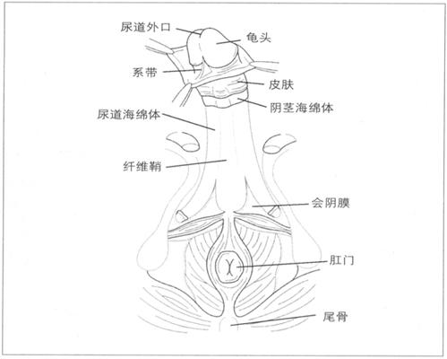 阴茎包括成对的海绵体和胶质体,其包绕着尿道,并延伸到远处成为龟头。这些结构在阴茎上为纤维鞘和自由活动并富有弹性的皮肤所覆盖,其延伸到远处成为包皮。海绵体附着于临近的耻骨下支(图214)。