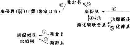 ①1912年称张北县、商都县;1922年析张北县、商都县,置康保招垦设治局。②1925年设治局改建为康保县。③1947年康保县与商都县、化德县合并,建立商化康联合县。④1947年撤销商化康联合县,恢复康保县原建制。⑤1958年康保县并入张北县。⑥1961年析张北县,复置康保县。