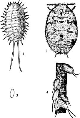 释义 | 康氏粉蚧 【学名】 Pseudococcus comstocki(Kuwane)。 【分布与为害】 在中国分布很广。江苏、浙江、山东、河北、新疆及东北等地均有。寄主有鹤望兰、石榴、常春藤、梅花、花桃、君子兰、朱顶红、栀子花、垂丝海棠等。成虫与若虫用刺吸枝、叶汁液,影响生长发育和开花。 【形态特征】 雌成虫椭圆形,较扁平,体长3~5毫米,粉红色,表面有白色蜡质物。虫体周围有17对白色蜡丝。蜡丝基部较粗,上部尖细,腹末1对蜡丝特别长。雄成虫体长1毫米,紫褐色,具尾毛。翅展2毫米,翅1对,透明。卵为椭圆形,长约0.3毫米,浅橙黄色。卵产于白絮状卵囊中(图5-75)。若虫体扁平、椭圆形,淡黄色,体长0.4毫米,外形与雌虫相似。蛹仅雄虫有,淡紫色,体长1.2毫米。 图5-75 康氏粉蚧 1.若虫 2.雌虫腹面 3.卵 4.为害状 【生活习性】 1年3代。以卵囊在寄主隐蔽处越冬。翌年5月中、下旬第一代若虫盛孵,7月中、下旬第二代若虫盛孵,8月下旬第三代若虫盛孵。雌若虫历期35~50天。雄若虫25~37天。雄若虫后期形成白色长形茧,化蛹茧内。雌成虫产卵时先形成絮状蜡质卵囊,再产卵其中。卵囊多产隐蔽处,也有产于土内的。每雌虫产卵200~400粒。 【防治方法】 (1)虫少时,剪去或刷去虫体。 (2)在初冬或早春喷波美3~5度石硫合剂,杀越冬虫源。 (3)在各代若虫盛孵期喷40%氧化乐果500倍液,或50%杀螟松500倍液,隔7天再喷1次。 |