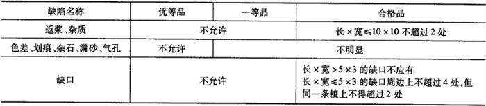释义 | 建筑水磨石制品 1.产品分类 (1)类别(表9-18) 表9-18 建筑水磨石制品的分类 (2)规格尺寸 水磨石的常用规格尺寸为300mm×300mm、305mm×305mm、400mm×400mm、500mm×500mm。其他规格尺寸由设计、使用部门与生产厂共同议定。 (3)等级 水磨石按其外观质量、尺寸偏差和物理力学性能分为优等品(A)、一等品(B)和合格品(C)。 2.技术要求 (1)外观质量 1)水磨石面层的外观缺陷规定见表9-19。 表9-19 水磨石面层的外观缺陷mm 注:一个缺角应计为相邻两棱边各有缺口1处。 2)水磨石磨光面有图案时,其越线和图案偏差应符合表9-20规定。 表9-20 水磨石磨光面的越线和图案偏差mm 3)同批水磨石磨光面上的石碴级配和颜色应基本一致。 (2)尺寸偏差 1)水磨石的规格尺寸允许偏差、平面度、角度允许极限公差应符合表9-21的规定。 表9-21 水磨石的规格mm 2)厚度小于或等于15mm的单面磨光水磨石,同块水磨石的厚度极差不得大于1mm;厚度大于15mm的单面磨光水磨石,同块水磨石上的厚度极差不得大于2mm。 3)侧面不磨光的拼缝水磨石,正面与侧面的夹角不得大于90°。 (3)出石率 磨光面的石碴分布应均匀。石碴粒径大于或等于3mm的水磨石,出石率应不小于55%。 (4)物理力学性能 1)抛光水磨石的光泽度,优等品不得低于45.0光泽单位;一等品不得低于35.0光泽单位;合格品不得低于25.0光泽单位。 2)水磨石的吸水率不得大于8.0%。 3)水磨石的抗折强度平均值不得低于5.0MPa,且单块最小值不得低于4.0MPa。 |
