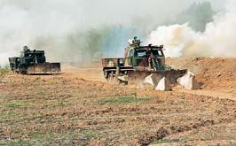 | 释义 | 开路机 亦称“军用推土机”。 装有组合式铲刀,主要用于快速构筑急造军路的野战工程机械。分为履带式和轮胎式两类。 在地形、土壤等条件允许时,一次通过可以开成宽四米左右的急造军路。 还可用于填平壕沟、弹坑,挖掘坦克、火炮掩体和工事平底坑等。