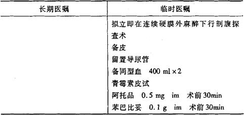 说明:(1)如病人处于休克状态,可先硬膜外备管采用局麻进入腹腔以手或器械控制出血,纠正休克后再硬膜外推麻醉药,也可以直接采用全麻。