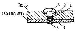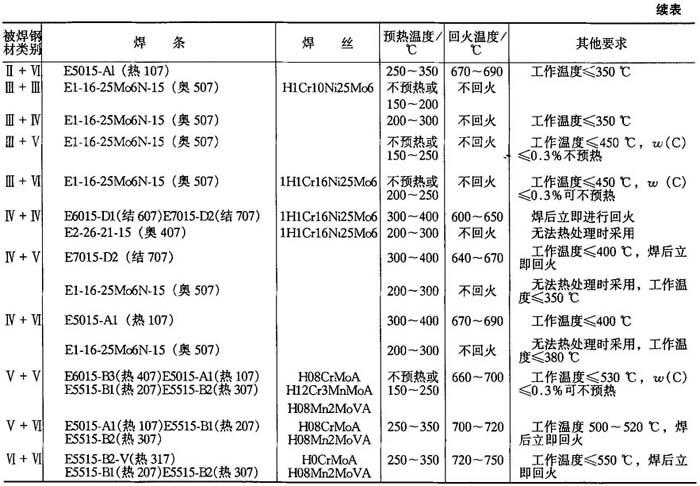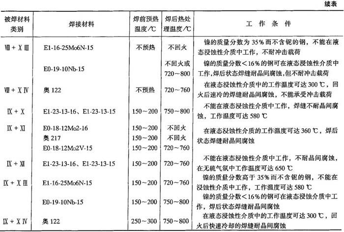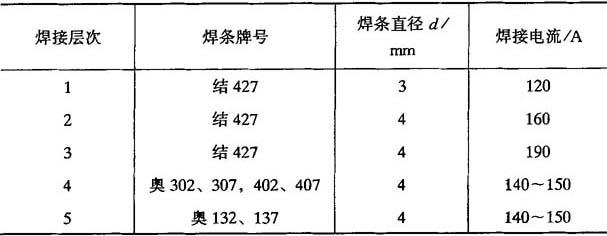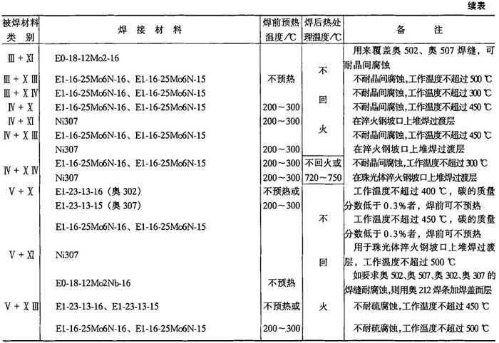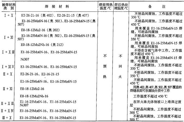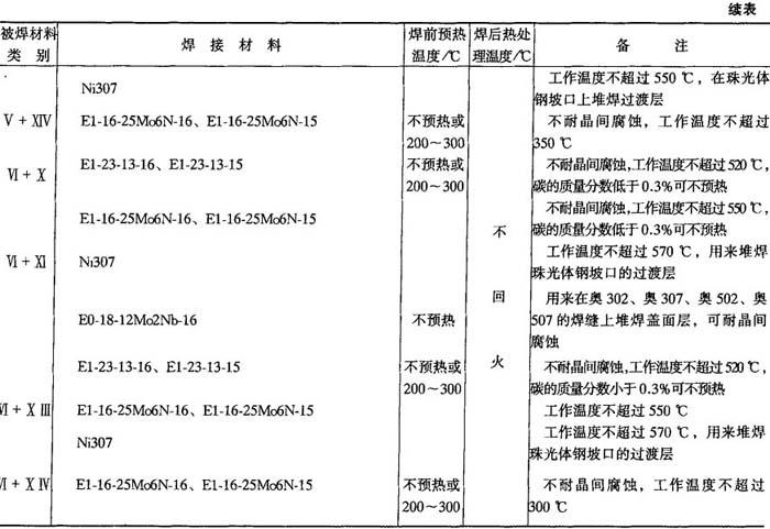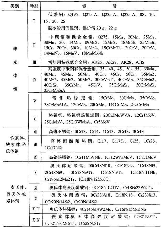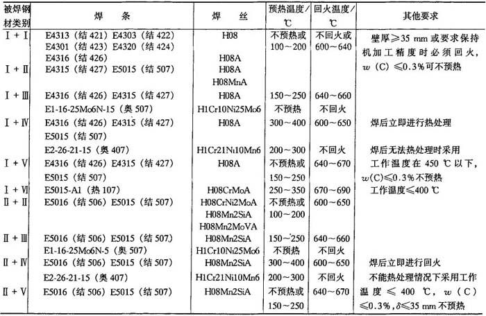 释义 | 异种钢焊接 10.2.4.1 异种钢的分类 用于制造异种钢焊接接头的钢种较多,按其金相组织分为三大类:珠光体钢(碳钢和低合金钢);铁素体钢和铁素体-马氏体钢(高铬钢);奥氏体钢和奥氏体-铁素体钢(铬镍钢).上述各种钢分别根据力学性能、用途分为14小类,如表10-37所示. 表10-36 奥氏体不锈钢焊接材料选用 ① GZ-1、GZ-2、GZ-5为黏结焊剂(非标准). ② 当选用熔炼焊剂时,因铬烧损,应注意焊丝成分选配. 表10-37 异种钢分类 10.2.4.2 不同珠光体钢焊接 焊接各类碳钢和低合金钢(Ⅰ~Ⅳ类)时,填充金属主要是保证焊接接头的常温或低温力学性能,而焊接V、Ⅵ类钢时,焊缝金属应具有一定的热强性能.焊接不同的珠光体钢时,主要是根据等强度(焊缝金属与异种接头中强度较低的钢等强度)要求选龋如表10-38所示.通常选用低氢焊条,以防止产生冷裂纹,并使焊缝金属具有良好的塑性. 10-2.4.3 珠光体钢与奥氏体钢的焊接 珠光体钢与奥氏体钢相连接的异种钢接头,一般都是采用高合金材料(Cr-Ni奥氏体钢或镍基合金)作为焊接材料,如表10-39所示. 10.2.4.4 铁素体钢与奥氏体钢的焊接 焊接铁素体钢与奥氏体钢异种接头时选用的焊接材料、预热温度和回火温度如表10-40所示. 10.2.4.5 不锈复合板的焊接 不锈复合板是由不锈钢复层和碳钢(或普通低合金钢)基层复合轧制而成的双金属板.由复层不锈钢保证耐腐蚀性,基层结构钢获得强度. 图10-11 外坡口不锈钢复合板焊接顺序 为保证复合板原有的综合性能,对于复层和基层应分别进行焊接.当用结构钢焊条焊接基层时,可能熔化到不锈钢复层,由于合金元素渗入焊缝,使焊缝金属硬度增加,塑性降低,易导致裂纹的产生.当用不锈钢焊条焊接复层时,可能熔化到结构钢基层,使焊缝合金成分稀释而降低焊缝金属的塑性和耐腐蚀性.为防止以上两种不良的结果,在基层和复层焊接之间必须采用过渡焊层的方法.在一般情况下,复层作为容器内壁,钢板开成外坡口,先焊基层焊缝,然后焊过渡层焊缝,最后焊复层焊缝.焊接顺序如图10-11所示. 用结构钢焊条焊接开坡口面的基面,焊层1、2、3逐渐焊满碳钢基层.然后从不锈钢复层一侧清焊根,深5~6mm,并用砂轮打磨.经X光检查合格后再焊过渡层4,采用高铬镍的不锈钢焊条(如奥302、奥307、奥402、奥407等)焊接.最后用奥132、奥137焊接复层焊缝5.外坡口不锈钢复合板焊接工艺参数如表10-41所示. 表10-38 焊接不同珠光体钢时焊条、预热温度和回火温度 表10-39 珠光体钢与奥氏体钢焊接时的焊条、预热温度和焊后热处理温度 表10-40 铁素体钢与奥氏体钢焊接时的焊接材料、预热温度和焊后热处理温度 表10-41 外坡口不锈钢复合板焊接工艺参数 |