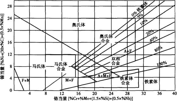 钢的最终组织结构由钢的镍当量(Nieq)和铬当量(Creq)的比例所控制,可以按各合金元素形成γ相和α相的能力,将其分别换算成镍当量和铬当量,利用Schaefiler图确定钢的组织,见下图。