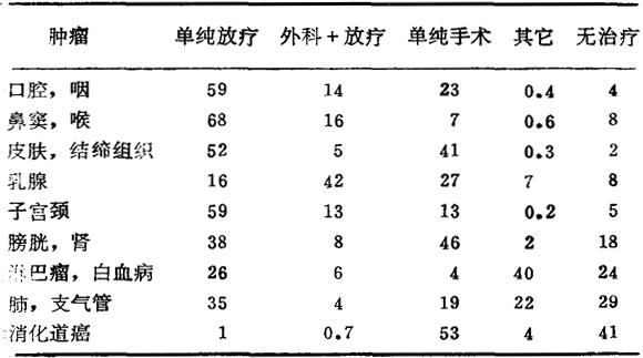 手术、放疗、化疗为当今肿瘤治疗的三大手段。我国常见10大肿瘤为:胃癌、食管癌、肝癌、大肠癌、鼻咽癌、肺癌、乳腺癌、宫颈癌、淋巴瘤及白血病。每一种肿瘤都或多或少、或主或辅地需要放射治疗。WHO的资料(表3-1)表明各种常见肿瘤需要放疗、手术及合并治疗的百分率。当然这个资料与我国情况不尽相同,但也可窥见一斑。