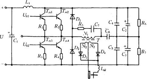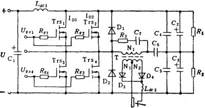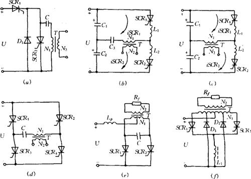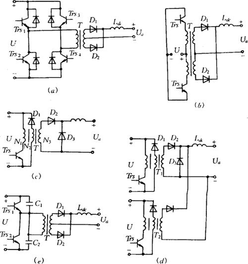 释义 | 弧焊逆变器主电路 1.晶闸管弧焊逆变器主电路六种基本形式(图11-15) 图11-15 晶闸管弧焊逆变器主电路基本形式 图11-15(a)为串联不对称半桥式电路:它通过SCR1和SCR2交替轮流通断,使变压器T的初级绕组N1与电容C之间形成振荡,在T的次级绕组N2获得低压中频电。 图11-15(b)(c)为串联对称半桥式电路:它是利用SCR1、SCR2轮流交替通断,在中频变压器T的初级绕组中产生中频电。 图11-15(d)为串联对称桥式电路:它是利用SCR1·4和SCR2·3轮流交替通断,在中频变压器T初级N1中产生中频电流。在N2中输出低压中频电。 图11-15(e)为并联式全波电路:它是利用SCR1和SCR2轮流交替通断及电容C的换流作用,在中频变压器T的初级绕组N1中通过中频交流电流,在N2中获得低压中频电。Lp的感应电势,产生反向电流,防止单向磁化。 图11-15(f)为并联式麦克默利电路:它同样是利用SCR1和SCR2的轮流交替通断,在中频变压器T的初级绕组N1中通过交流电流,在次级N2中获得低压中频电。SCR1及SCR2的换流关断是靠L1实现的。二极管D1及D2是在SCR1及SCR2关断时,为L1的感应电势提供一个释放回路,通过N1的部分绕组反向导电,对T去磁,防止单向磁化。 2.晶体管弧焊逆变电源主电路基本形式 图11-16是串联半桥式晶体管弧焊电源的主电路。直流输入电压U,由单相或三相输入整流桥提供,经L1滤波,对电解电容C2、C3充电。UC2、UC3分别供给Trs1、Trs2与Trs3、Trs4工作电压。晶体管组Trs1、Trs2和Trs3、Trs4受控制信号Ub1和Ub2控制,轮流交替通断,在中频变压器T的初级绕组N1中通过中频交流电流,次级绕组N2输出低压中频电。R1-R4为Trs1-Trs4的均流电阻。 图11-16 串联半桥式晶体管弧焊逆变电源主电路 除串联半桥式之外,晶体管弧焊逆变电源主电路常用的还有四种。其原理电路如图11-17所示。 图11-17 晶体管弧焊逆变器主电路基本形式 图11-17(a)为串联全桥式电路:Trs集射极之间电压为电源电压U。靠Trs1、Trs4和Trs3、Trs2二组大功率晶体管轮流交替通断,在中频变压T的初级N1中通过中频交流电流。在次级N2中输出低压中频电。经D1、D2整流、Ldc滤波,供较大电流的直流电弧焊。 图11-17(b)为并联推挽式电路:Trs集射极之间承受ZU电压,Trs两组轮流交替导通使中频变压器T输出低压中频电,经D1、D2整流,Ldc滤波,供较大电流场合的直流电弧焊。 图11-17(c)为单端通向开关电路:为限制晶体管Trs集射极的尖峰电压,该电路设有带去磁绕组的二极管D1箝位电路,使Trs集射极电压Uce不超过2U。这种电路不存在晶体管Trs正负半波同时导通的问题,适用于小电流焊接场合。 图11-17(d)为双端通向开关电路:由两个单端通向开关电路并联组成,输出功率提高1倍,有利于减小输出电抗器的体积和改善波纹度、适用于较大焊接电流的场合。 3.场效应管弧焊逆变电源的主电路 其基本形式与晶体管式弧焊逆变电源主电路相同,但由于通断控制信号是电压,而不是电流,所以效率更高,逆变频率也可以提得更高(50kHz以上)。图11-18为场效应管半桥式弧焊逆变电源原理电路图。 图11-18 场效应管半桥式弧焊逆变电源主电路 |