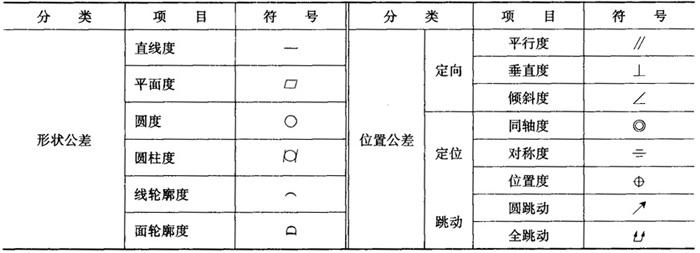 释义 | 形位公差 形位公差项目名称及符号见表2-16,直线度和平面度公差值见表2-17,圆度和圆柱度公差值见表2-18,平行度、垂直度和倾斜度公差值见表2-19,同轴度、对称度、圆跳动和全跳动公差值见表2-20。 表2-16 形状和位置公差项目名称及符号 表2-17 直线度和平面度公差值 表2-18 圆度和圆柱度公差值 表2-19 平行度、垂直度和倾斜度公差值 表2-20 同轴度、对称度、圆跳动和全跳动公差值 |