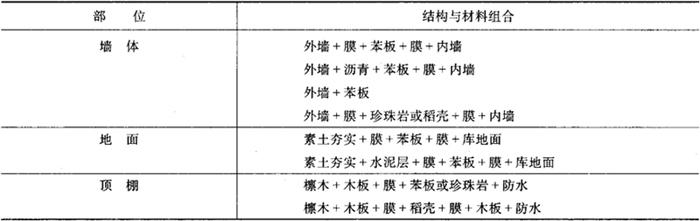 注:微型节能冷库常用的防潮隔汽材料为0.1~0.2mm厚的聚乙烯薄膜(施工时应注意薄膜完整),即表中的“膜”。 微型节能冷库的库顶多种多样,这与各地农村习俗有关。由于屋面受太阳辐射作用大,温度高,所以该处的保温十分重要,并且要保证防水。屋顶的保温一般采用吊顶的做法,即在屋顶的下面做吊顶,吊顶上铺木板,木板上部是保温材料,再上部为隔汽层。 3.微型节能冷库的无冷桥设计与施工 冷桥即冷库库体由于建筑结构不合理,建筑中隔热层中断所出现的隔热性能较差的部位。在使用中冷桥处容易出现结冰霜现象,既漏冷,又损害库体结构。 冷桥处理的方法很多,下面介绍微型节能冷库常采用的处理方法: (1)顶棚。顶棚的无冷桥设计主要有以下几种,如图3-25、图3-26所示。