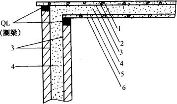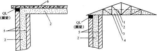 图3-25 外墙承重顶棚无冷桥结构示意图 1-保温材料保护层 2-保温材料 3-防潮隔汽层 4-檩上木板或其他保温材料支撑物 5-防潮隔汽层 6-防水层